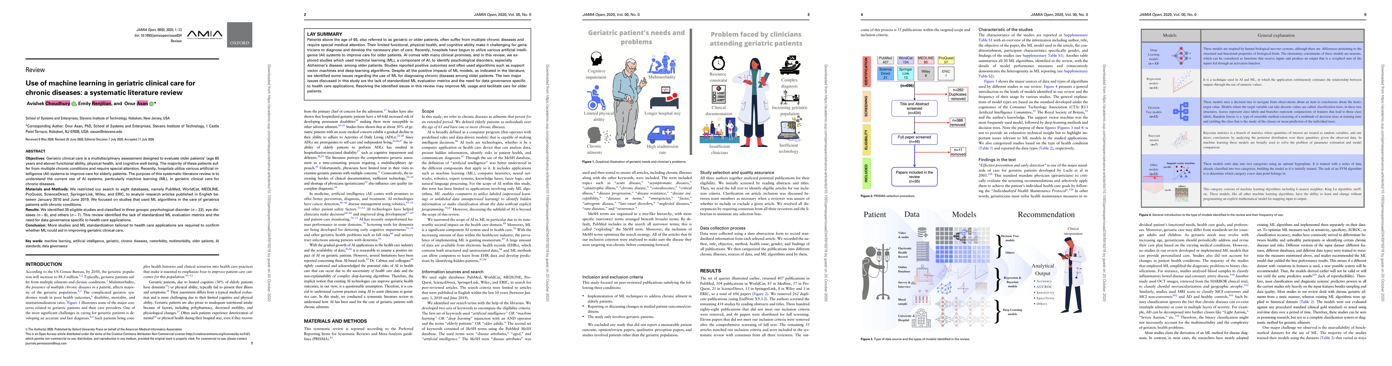 Objectives-Geriatric clinical care is a multidisciplinary assessment designed to evaluate older patients (age 65 years and above) functional ability, physical health, and cognitive wellbeing. The majority of these patients suffer from multiple chronic conditions and require special attention. Recently, hospitals utilize various artificial intelligence (AI) systems to improve care for elderly patients. The purpose of this systematic literature review is to understand the current use of AI systems, particularly machine learning (ML), in geriatric clinical care for chronic diseases. Materials and Methods-We restricted our search to eight databases, namely PubMed, WorldCat, MEDLINE, ProQuest, ScienceDirect, SpringerLink, Wiley, and ERIC, to analyze research articles published in English between January 2010 and June 2019. We focused on studies that used ML algorithms in the care of geriatrics patients with chronic conditions. Results-We identified 35 eligible studies and classified in three groups-psychological disorder (n=22), eye diseases (n=6), and others (n=7). This review identified the lack of standardized ML evaluation metrics and the need for data governance specific to health care applications. Conclusion- More studies and ML standardization tailored to health care applications are required to confirm whether ML could aid in improving geriatric clinical care.