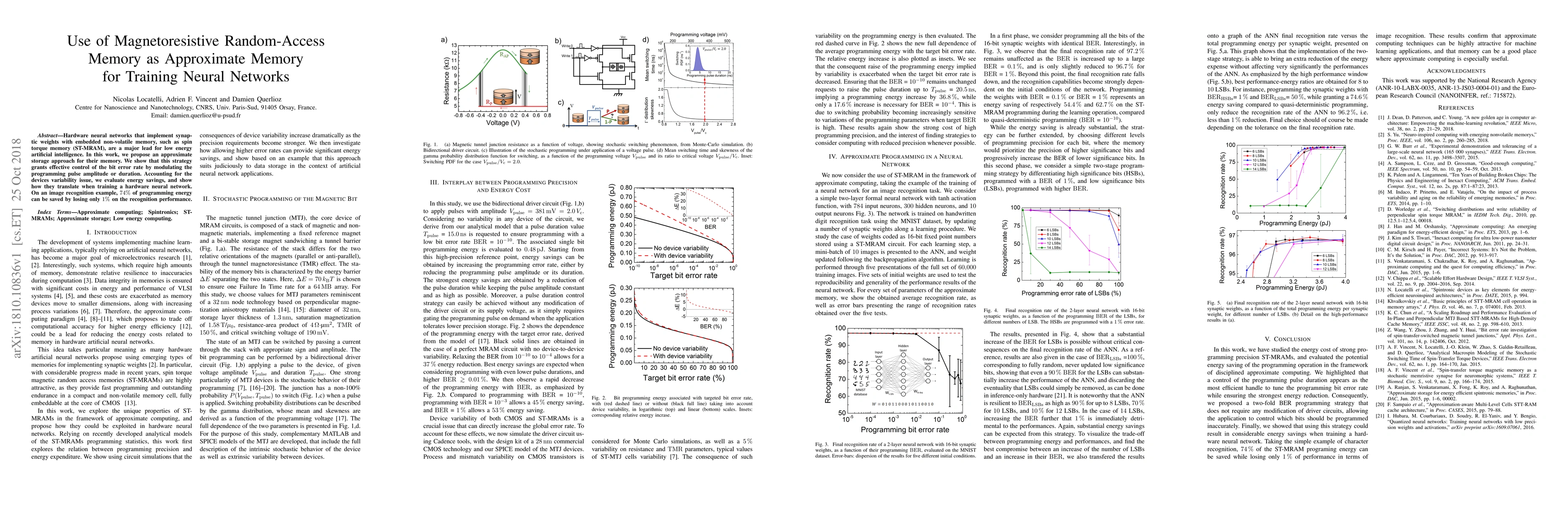 This paper proposes an approximate memory strategy for magnetoresistive random-access memory (MRAM) used in hardware neural networks, achieving significant energy savings by controlling bit error rates. The study demonstrates that up to 74% of programming energy can be saved during training while maintaining 99% recognition performance.