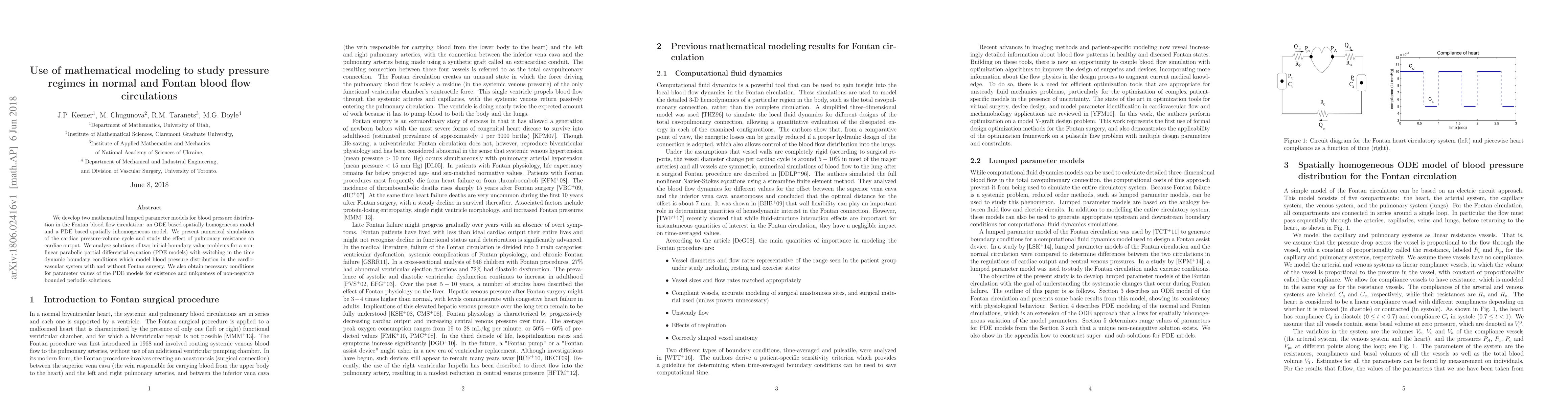 We develop two mathematical lumped parameter models for blood pressure distribution in the Fontan blood flow circulation: an ODE based spatially homogeneous model and a PDE based spatially inhomogeneous model. We present numerical simulations of the cardiac pressure-volume cycle and study the effect of pulmonary resistance on cardiac output. We analyze solutions of two initial-boundary value problems for a non-linear parabolic partial differential equation (PDE models) with switching in the time dynamic boundary conditions which model blood pressure distribution in the cardiovascular system with and without Fontan surgery. We also obtain necessary conditions for parameter values of the PDE models for existence and uniqueness of non-negative bounded periodic solutions.