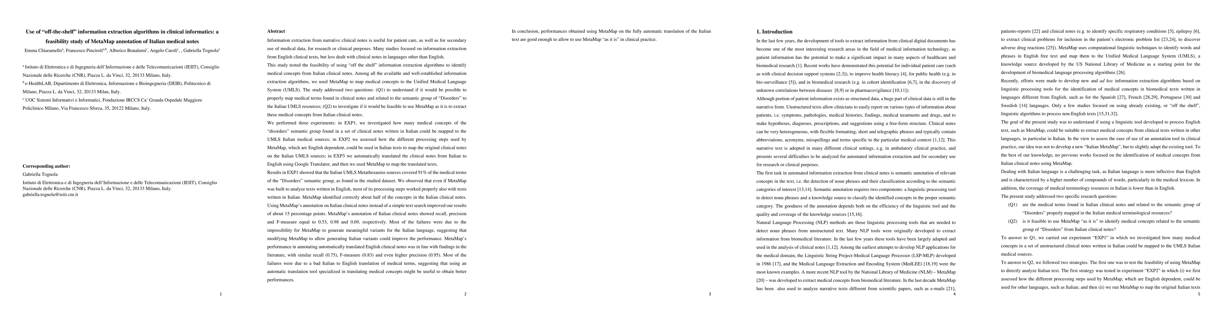 This study assessed the feasibility of using MetaMap, an information extraction tool, to identify medical concepts from Italian clinical notes. Results showed that MetaMap could map 91% of the 'Disorders' semantic group terms to the Italian UMLS resources, achieving a recall of 0.53 and precision of 0.98, indicating its potential despite challenges with Italian language variants.