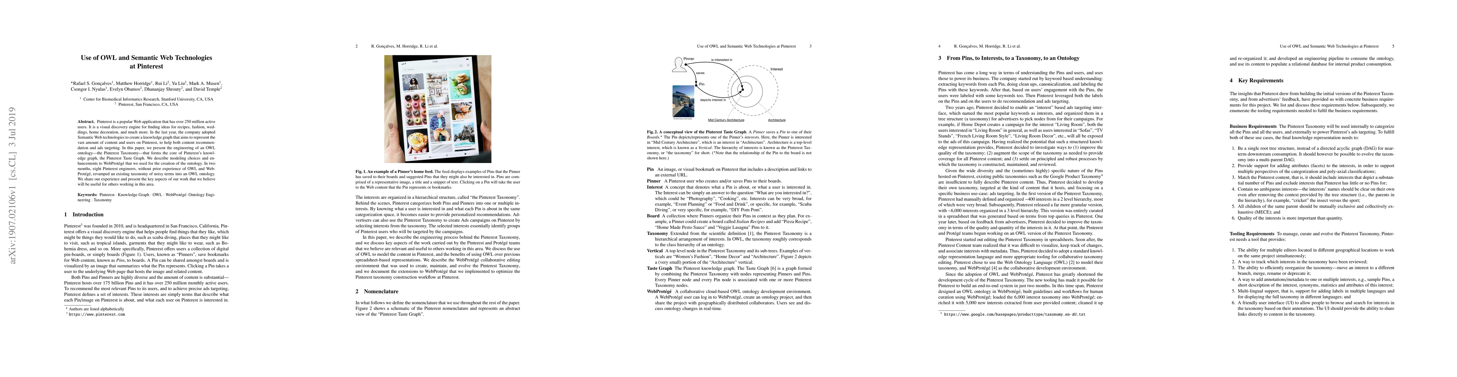 Pinterest developed an OWL ontology, the Pinterest Taxonomy, to create a knowledge graph enhancing content recommendation and ad targeting. In just two months, eight engineers transformed a noisy taxonomy into a robust OWL ontology using WebProtégé, sharing insights for future projects in this domain.