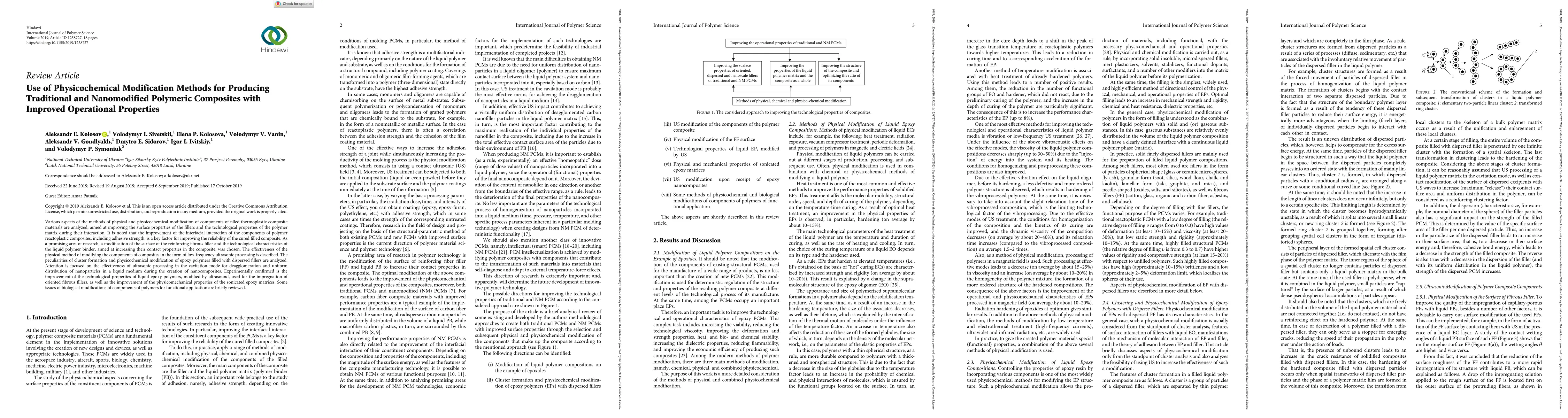 Various aspects of the methods of physical and physicochemical modification of components of filled thermoplastic composite materials are analyzed, aimed at improving the surface properties of the fillers and the technological properties of the polymer matrix during their interaction. It is noted that the improvement of the interfacial interaction of the components of polymer reactoplastic composites, including adhesive strength, is a key factor for improving the reliability of the cured filled composite. As a promising area of research, a modification of the surface of the reinforcing fibrous filler and the technological characteristics of the liquid polymer binder, aimed at increasing their contact properties in the composite, was chosen. The effectiveness of the physical method of modifying the components of composites in the form of low-frequency ultrasonic processing is described. The peculiarities of cluster formation and physicochemical modification of epoxy polymers filled with dispersed fillers are analyzed. Attention is focused on the effectiveness of ultrasonic processing in the cavitation mode for deagglomeration and uniform distribution of nanoparticles in a liquid medium during the creation of nanocomposites. Experimentally confirmed is the improvement of the technological properties of liquid epoxy polymers, modified by ultrasound, used for the impregnation of oriented fibrous fillers, as well as the improvement of the physicomechanical properties of the sonicated epoxy matrices. Some issues of biological modifications of components of polymers for functional application are briefly reviewed.