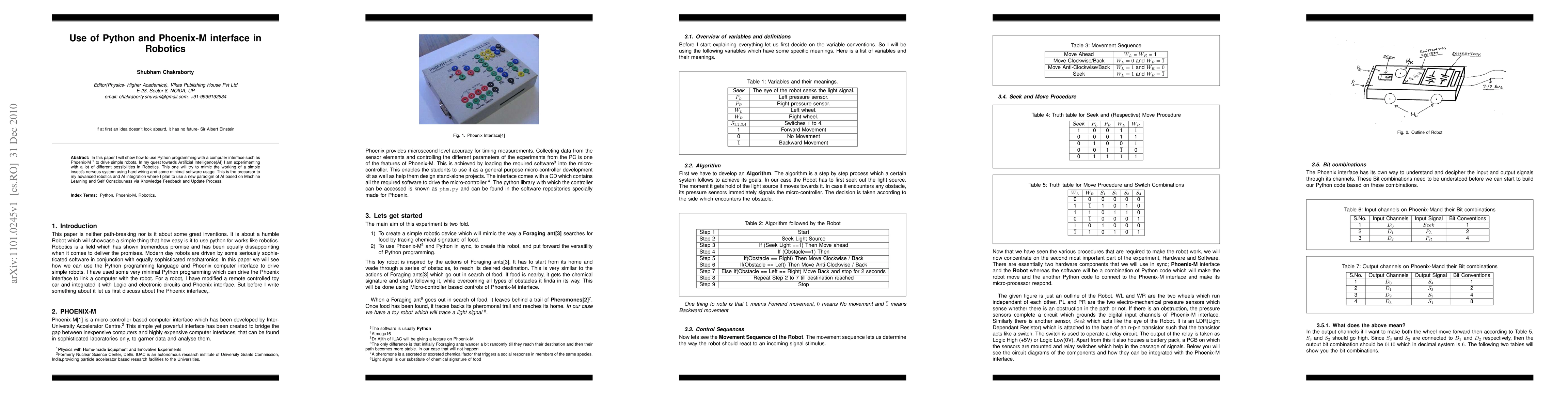 In this paper I will show how to use Python programming with a computer interface such as Phoenix-M 1 to drive simple robots. In my quest towards Artificial Intelligence(AI) I am experimenting with a lot of different possibilities in Robotics. This one will try to mimic the working of a simple insect's nervous system using hard wiring and some minimal software usage. This is the precursor to my advanced robotics and AI integration where I plan to use a new paradigm of AI based on Machine Learning and Self Consciousness via Knowledge Feedback and Update Process.