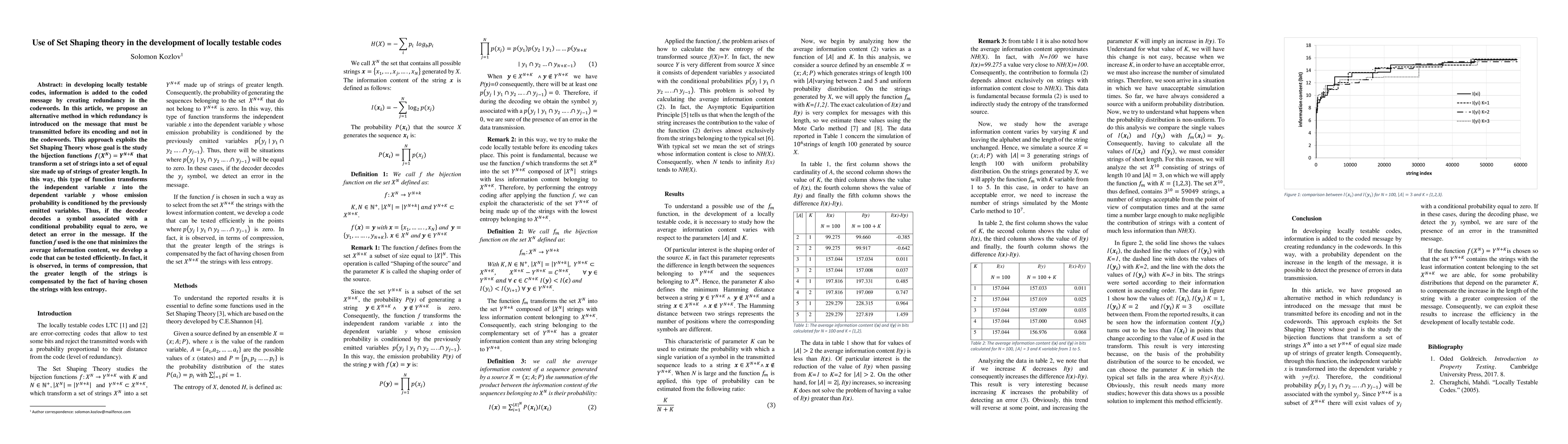 In developing locally testable codes, information is added to the coded message by creating redundancy in the codewords. In this article, we propose an alternative method in which redundancy is introduced on the message that must be transmitted before its encoding and not in the codewords. This approach exploits the Set Shaping Theory whose goal is the study the bijection functions f(X)=Y that transform a set of strings into a set of equal size made up of strings of greater length. In this way, this type of function transforms the independent variable x into the dependent variable y whose emission probability is conditioned by the previously emitted variables. Thus, if the decoder decodes a symbol associated with a conditional probability equal to zero, we detect an error in the message. If the function f used is the one that minimizes the average information content, we develop a code that can be tested efficiently. In fact, it is observed, in terms of compression, that the greater length of the strings is compensated by the fact of having chosen the strings with less entropy.