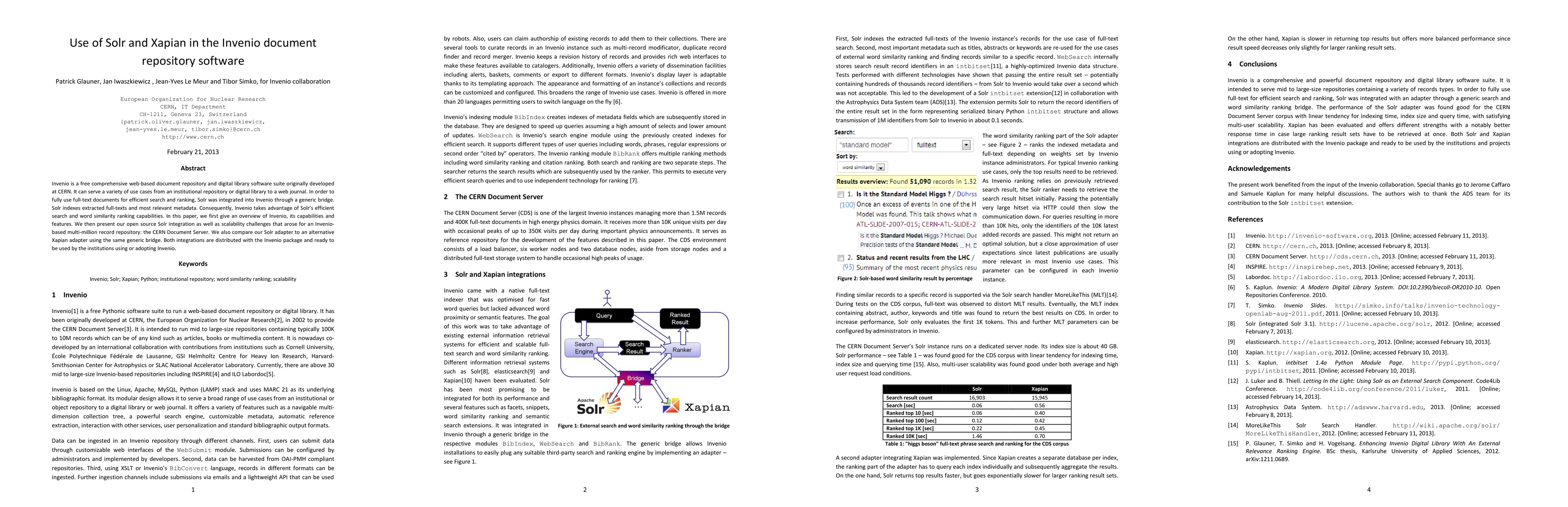 Invenio is a free comprehensive web-based document repository and digital library software suite originally developed at CERN. It can serve a variety of use cases from an institutional repository or digital library to a web journal. In order to fully use full-text documents for efficient search and ranking, Solr was integrated into Invenio through a generic bridge. Solr indexes extracted full-texts and most relevant metadata. Consequently, Invenio takes advantage of Solr's efficient search and word similarity ranking capabilities. In this paper, we first give an overview of Invenio, its capabilities and features. We then present our open source Solr integration as well as scalability challenges that arose for an Invenio-based multi-million record repository: the CERN Document Server. We also compare our Solr adapter to an alternative Xapian adapter using the same generic bridge. Both integrations are distributed with the Invenio package and ready to be used by the institutions using or adopting Invenio.