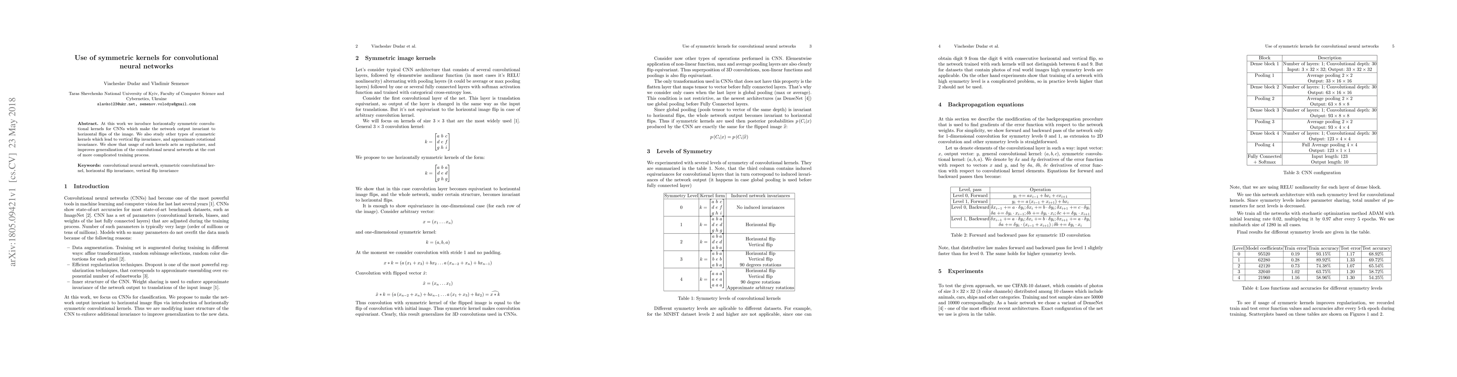 This paper proposes the use of symmetric convolutional kernels in CNNs to achieve invariance to horizontal and vertical flips, and approximate rotational invariance, which acts as a regularizer and improves generalization, albeit with a more complex training process.