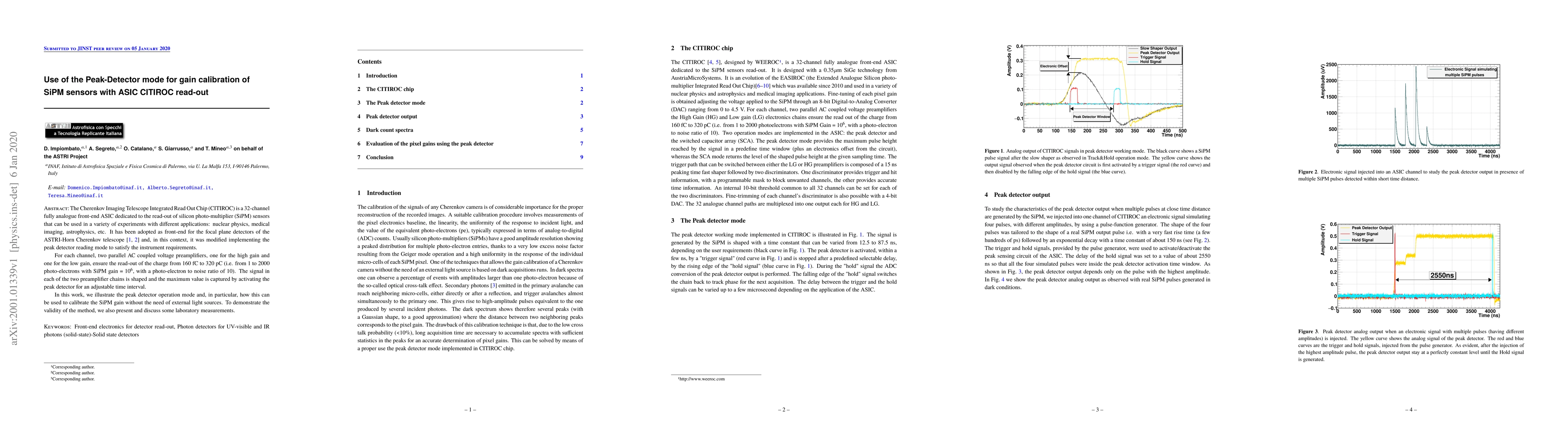 This paper discusses the use of the peak-detector mode in the CITIROC ASIC for gain calibration of SiPM sensors, eliminating the need for external light sources. Laboratory measurements validate the method, demonstrating its effectiveness in various applications like nuclear physics, medical imaging, and astrophysics.