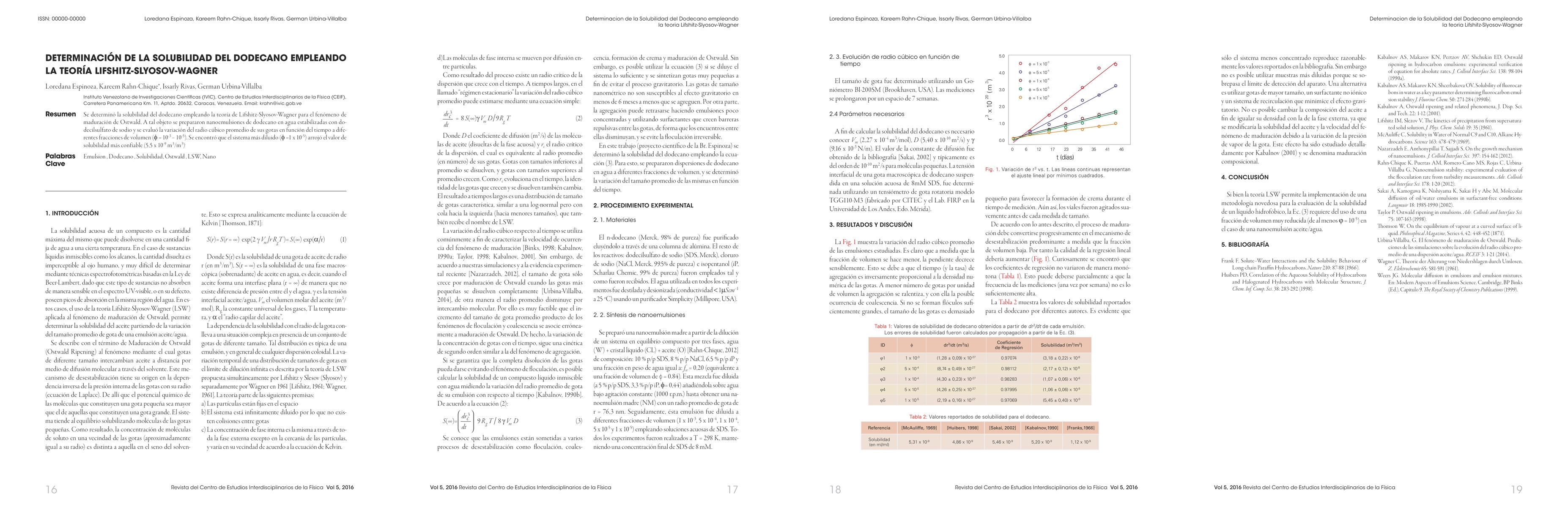 The solubility of dodecane was determined using the theory of Lifshitz-Slyosov-Wagner for the Ostwald ripening phenomenon. For this purpose, a set of dodecane in water nanoemulsions stabilized with sodium dodecylsulfate was prepared. The average cubic radius of the dispersions was followed as a function of time for volume fractions between 0.001 and 0.00001. The correct solubility (5.5 x 10-9 m3/m3) was only reproduced by the most dilute system.