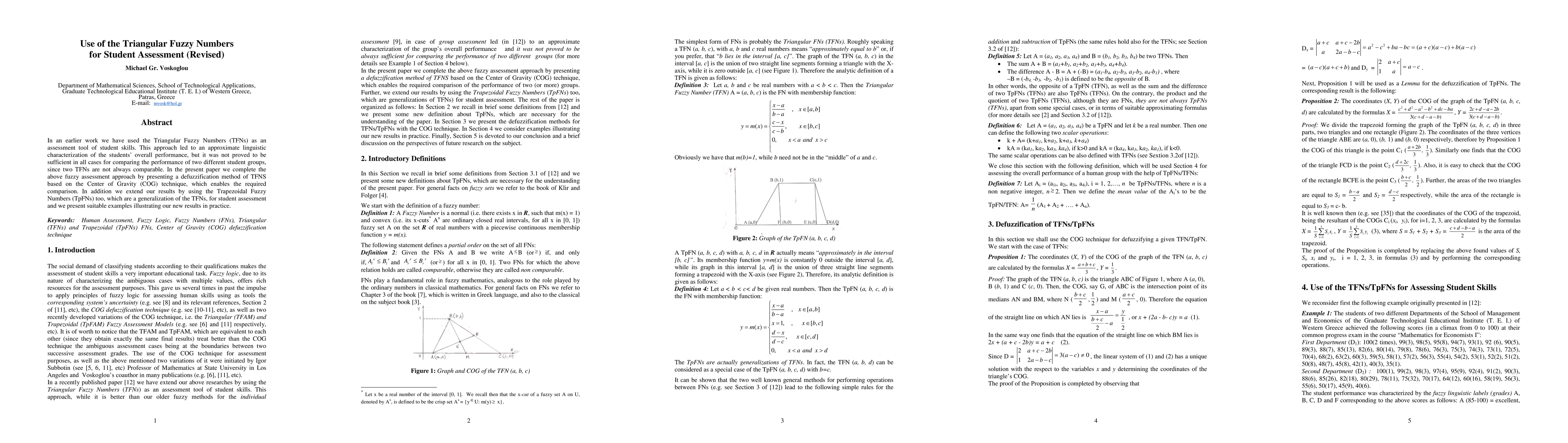 This paper refines the use of Triangular Fuzzy Numbers (TFNs) for student assessment by introducing a defuzzification method based on the Center of Gravity (COG) technique, enabling comparisons between student groups. It also extends the approach to Trapezoidal Fuzzy Numbers (TpFNs) for more comprehensive student performance evaluation.