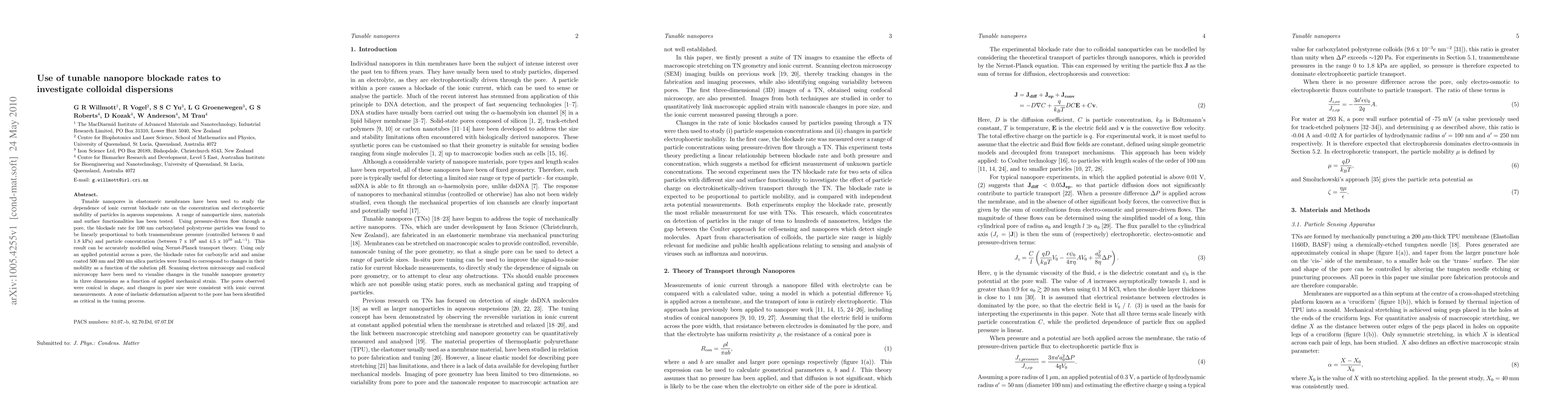 This study utilizes tunable nanopores in elastomeric membranes to investigate ionic current blockade rates in colloidal dispersions, revealing linear relationships between blockade rate, pressure, and particle concentration. The research also correlates blockade rates with particle mobility changes under varying pH conditions, and employs microscopy to visualize the nanopore geometry and its deformation under mechanical strain.
