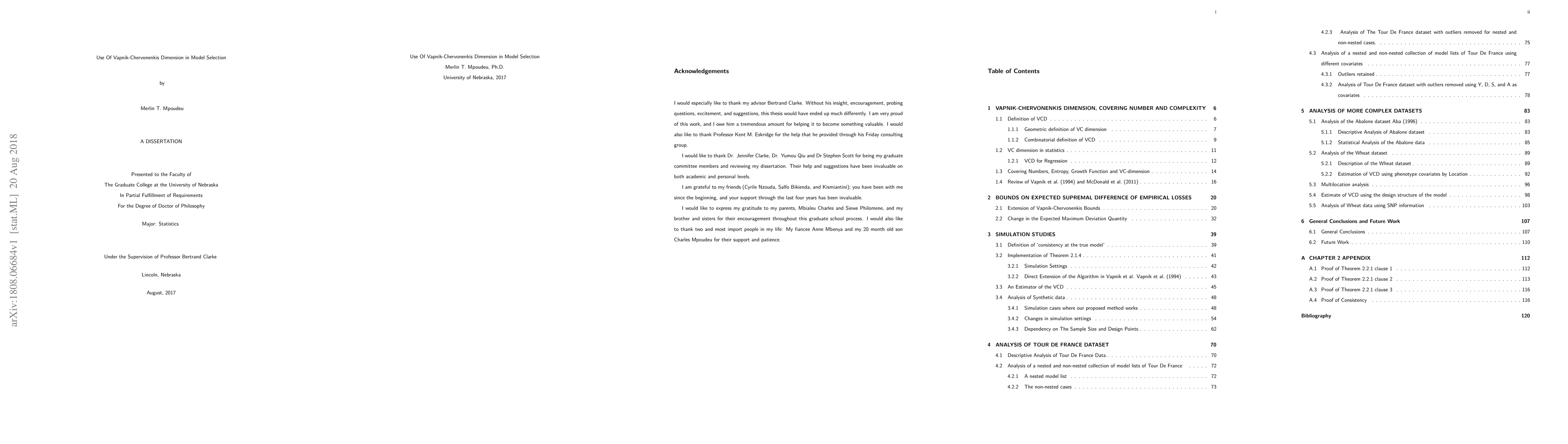 In this dissertation, I derive a new method to estimate the Vapnik-Chervonenkis Dimension (VCD) for the class of linear functions. This method is inspired by the technique developed by Vapnik et al. Vapnik et al. (1994). My contribution rests on the approximation of the expected maximum difference between two empirical Losses (EMDBTEL). In fact, I use a cross-validated form of the error to compute the EMDBTEL, and I make the bound on the EMDBTEL tighter by minimizing a constant in of its right upper bound. I also derive two bounds for the true unknown risk using the additive (ERM1) and the multiplicative (ERM2) Chernoff bounds. These bounds depend on the estimated VCD and the empirical risk. These bounds can be used to perform model selection and to declare with high probability, the chosen model will perform better without making strong assumptions about the data generating process (DG). I measure the accuracy of my technique on simulated datasets and also on three real datasets. The model selection provided by VCD was always as good as if not better than the other methods under reasonable conditions.