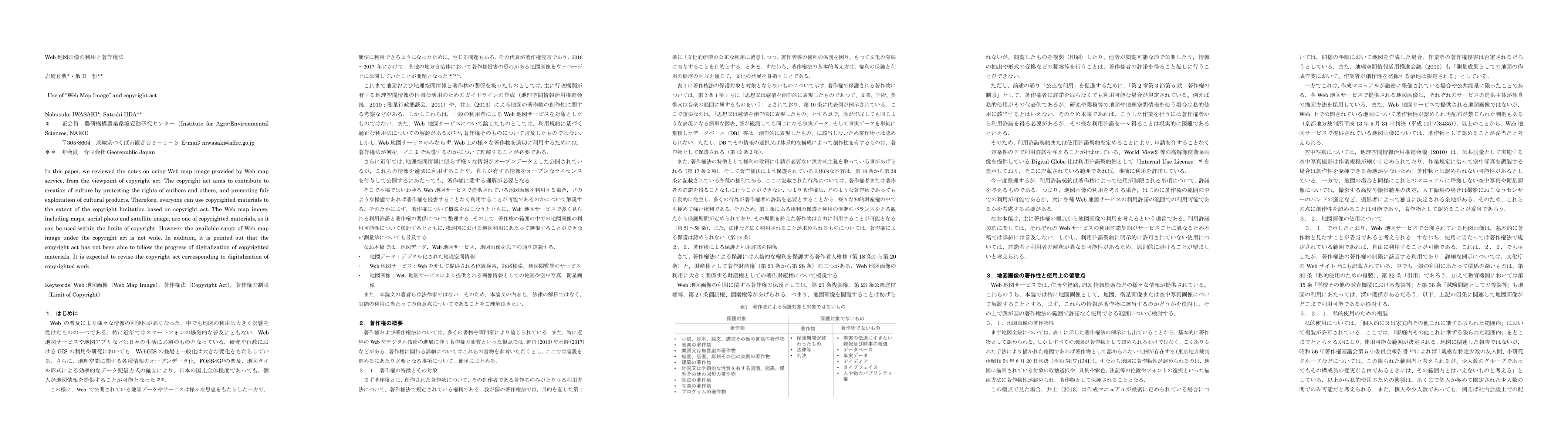 In this paper, we reviewed the notes on using Web map image provided by Web map service, from the viewpoint of copyright act. The copyright act aims to contribute to creation of culture by protecting the rights of authors and others, and promoting fair exploitation of cultural products. Therefore, everyone can use copyrighted materials to the extent of the copyright limitation based on copyright act. The Web map image, including maps, aerial photo and satellite image, are one of copyrighted materials, so it can be used within the limits of copyright. However, the available range of Web map image under the copyright act is not wide. In addition, it is pointed out that the copyright act has not been able to follow the progress of digitalization of copyrighted materials. It is expected to revise the copyright act corresponding to digitalization of copyrighted work.