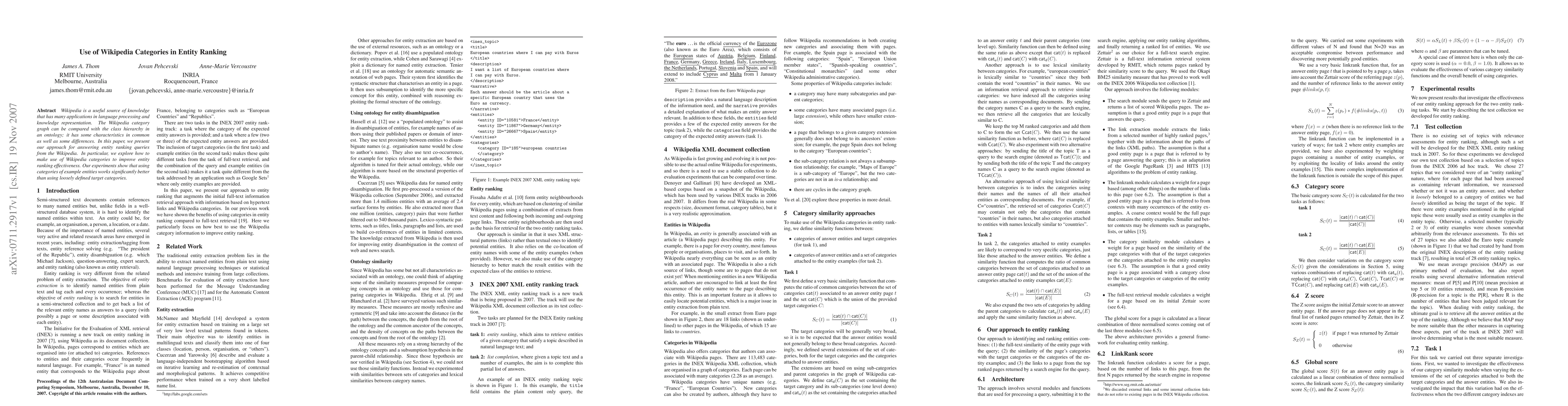 This paper proposes a method to enhance entity ranking by leveraging Wikipedia categories, demonstrating that utilizing specific example entities' categories significantly outperforms the use of broad, loosely defined target categories. Experimental results validate the effectiveness of this approach.
