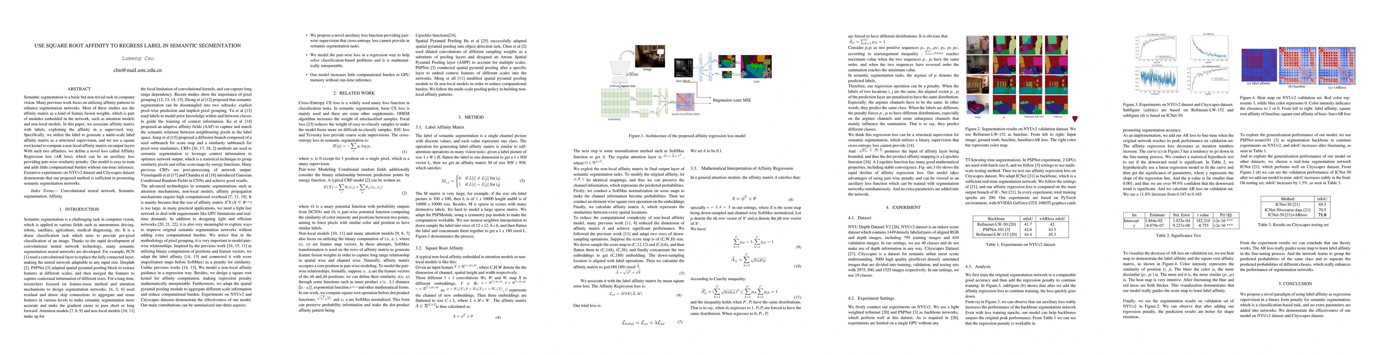 This paper proposes a novel Affinity Regression loss (AR loss) that leverages square root affinity and multi-scale label affinity matrices to enhance semantic segmentation. The method introduces structural supervision and non-local affinity computation, improving segmentation performance with minimal computational overhead.