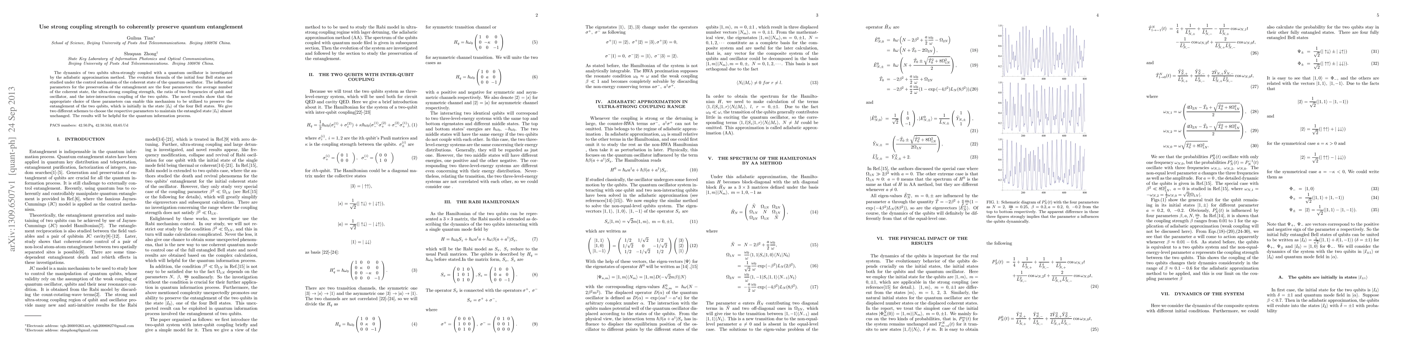 The dynamics of two qubits ultra-strongly coupled with a quantum oscillator is investigated by the adiabatic approximation method. The evolution formula of the initial four Bell states are studied under the control mechanism of the coherent state of the quantum oscillator. The influential parameters for the preservation of the entanglement are the four parameters: the average number of the coherent state, the ultra-strong coupling strength, the ratio of two frequencies of qubit and oscillator, and the inter-interaction coupling of the two qubits. The novel results show that the appropriate choice of these parameters can enable this mechanism to be utilized to preserve the entanglement of the two qubits, which is initially in the state |I_0> of the four Bell states. We give two different schemes to choose the respective parameters to maintain the entangled state |I_0> almost unchanged. The results will be helpful for the quantum information process.