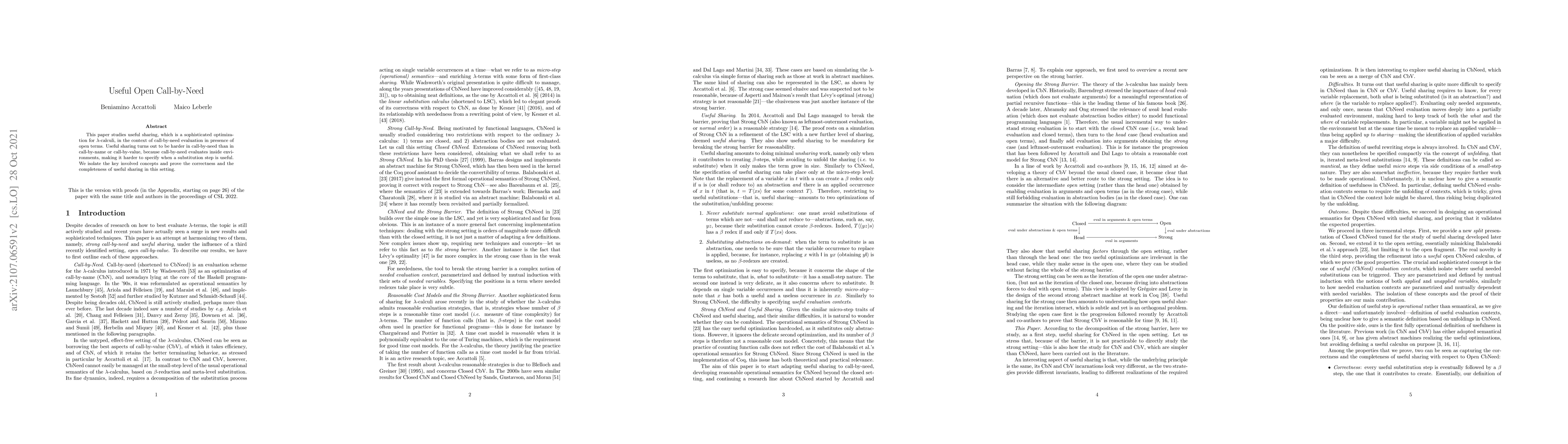 This paper explores optimizing lambda-calculi through useful sharing in call-by-need evaluation with open terms, demonstrating its complexity compared to call-by-name or call-by-value, and proves its correctness and completeness.