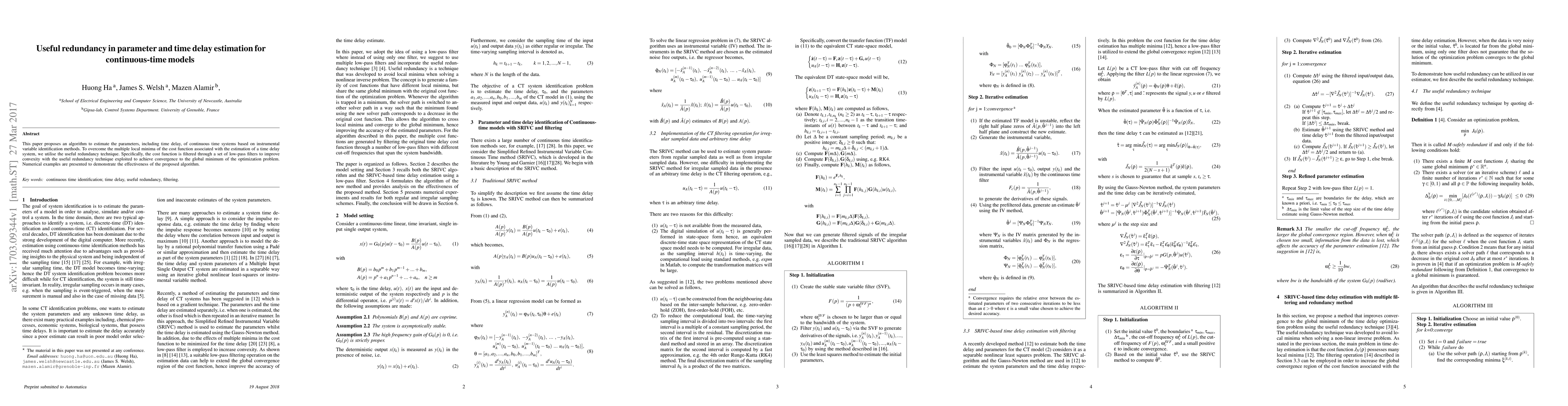This paper introduces an algorithm for estimating parameters and time delays in continuous-time systems using instrumental variable identification, leveraging useful redundancy to overcome local minima and improve convergence to the global minimum. Numerical examples validate the algorithm's effectiveness.