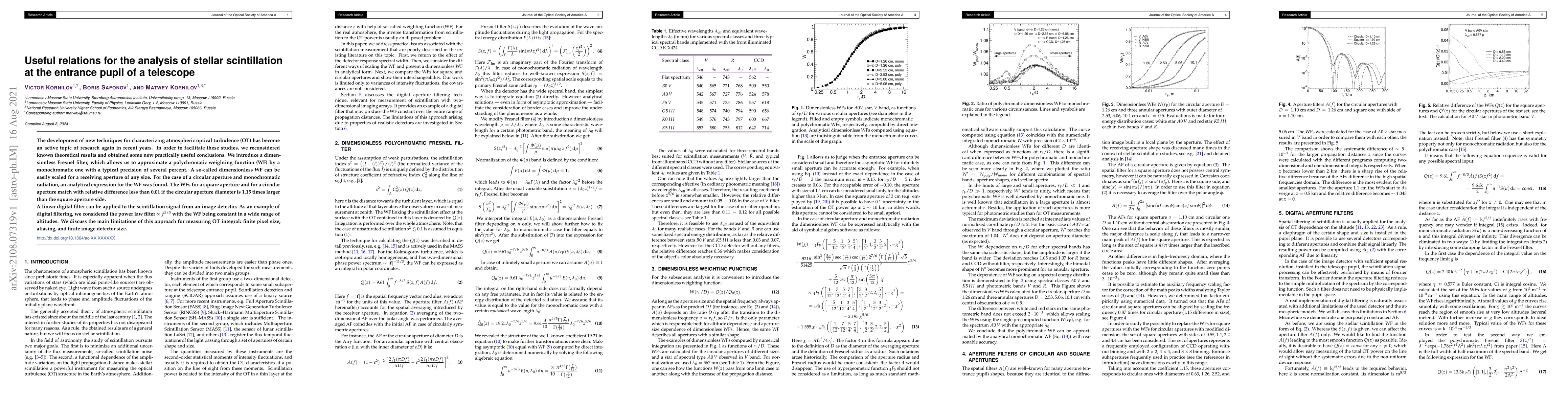 The development of new techniques for characterizing atmospheric optical turbulence (OT) has become an active topic of research again in recent years. In order to facilitate these studies, we reconsidered known theoretical results and obtained some new practically useful conclusions. We introduce a dimensionless Fresnel filter, which allows us to approximate a polychromatic weighting function (WF) by a monochromatic one with a typical precision of several percent. A so-called dimensionless WF can be easily scaled for a receiving aperture of any size. For the case of a circular aperture and monochromatic radiation, an analytical expression for the WF was found. The WFs for a square aperture and for a circular aperture match with relative difference less than 0.01 if the circular aperture diameter is 1.15 times larger than the square aperture side. A linear digital filter can be applied to the scintillation signal from an image detector. As an example of digital filtering, we considered the power law filter $\propto f^{5/3}$ with the WF being constant in a wide range of altitudes. We discuss the main limitations of this approach for measuring OT integral: finite pixel size, aliasing, and finite image detector size.