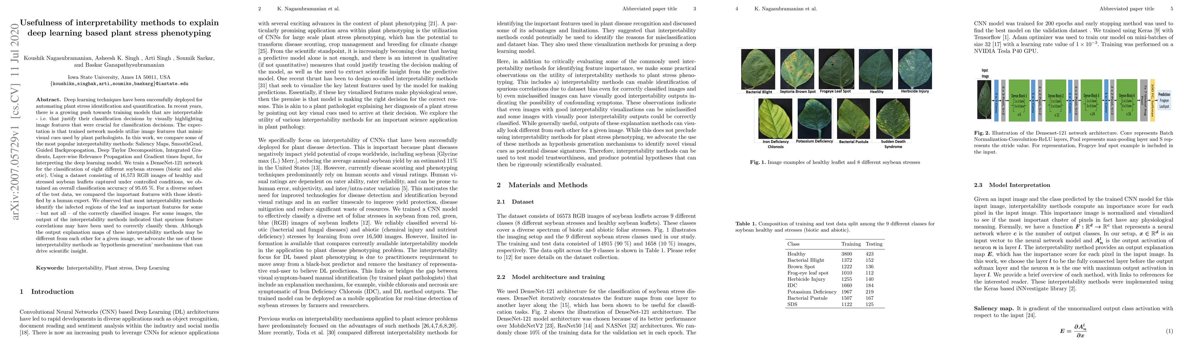 Deep learning techniques have been successfully deployed for automating plant stress identification and quantification. In recent years, there is a growing push towards training models that are interpretable -i.e. that justify their classification decisions by visually highlighting image features that were crucial for classification decisions. The expectation is that trained network models utilize image features that mimic visual cues used by plant pathologists. In this work, we compare some of the most popular interpretability methods: Saliency Maps, SmoothGrad, Guided Backpropogation, Deep Taylor Decomposition, Integrated Gradients, Layer-wise Relevance Propagation and Gradient times Input, for interpreting the deep learning model. We train a DenseNet-121 network for the classification of eight different soybean stresses (biotic and abiotic). Using a dataset consisting of 16,573 RGB images of healthy and stressed soybean leaflets captured under controlled conditions, we obtained an overall classification accuracy of 95.05 \%. For a diverse subset of the test data, we compared the important features with those identified by a human expert. We observed that most interpretability methods identify the infected regions of the leaf as important features for some -- but not all -- of the correctly classified images. For some images, the output of the interpretability methods indicated that spurious feature correlations may have been used to correctly classify them. Although the output explanation maps of these interpretability methods may be different from each other for a given image, we advocate the use of these interpretability methods as `hypothesis generation' mechanisms that can drive scientific insight.