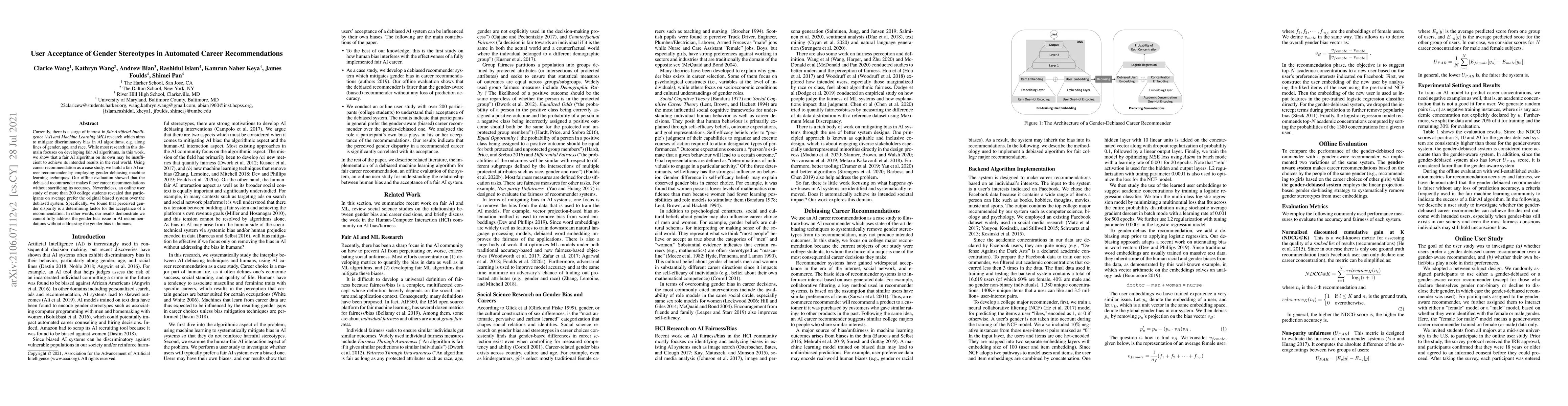 Currently, there is a surge of interest in fair Artificial Intelligence (AI) and Machine Learning (ML) research which aims to mitigate discriminatory bias in AI algorithms, e.g. along lines of gender, age, and race. While most research in this domain focuses on developing fair AI algorithms, in this work, we show that a fair AI algorithm on its own may be insufficient to achieve its intended results in the real world. Using career recommendation as a case study, we build a fair AI career recommender by employing gender debiasing machine learning techniques. Our offline evaluation showed that the debiased recommender makes fairer career recommendations without sacrificing its accuracy. Nevertheless, an online user study of more than 200 college students revealed that participants on average prefer the original biased system over the debiased system. Specifically, we found that perceived gender disparity is a determining factor for the acceptance of a recommendation. In other words, our results demonstrate we cannot fully address the gender bias issue in AI recommendations without addressing the gender bias in humans.