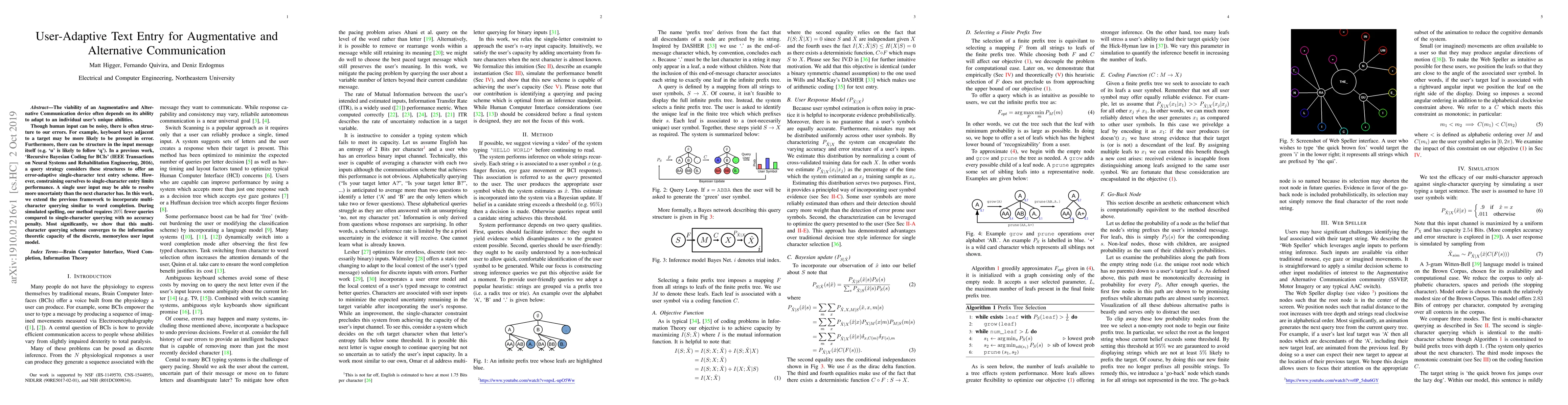 This paper proposes an adaptive text entry system for augmentative and alternative communication devices that leverages both single-character and multi-character querying to improve efficiency. The method reduces query requirements by 20% during simulated spelling compared to single-character entry, achieving near-optimal performance.