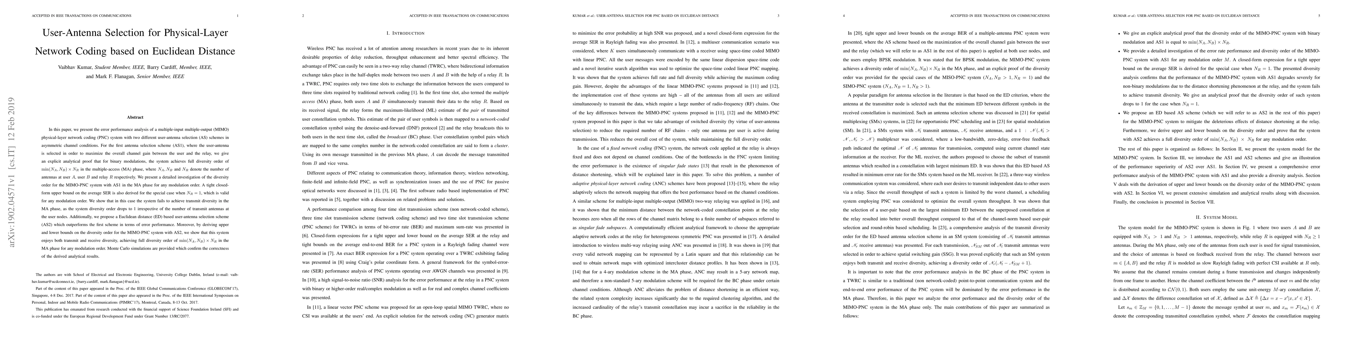 This paper analyzes the error performance of a MIMO physical-layer network coding system under two user-antenna selection schemes. The first scheme (AS1) maximizes channel gain but fails to achieve transmit diversity in the multiple-access phase. The second scheme (AS2), based on Euclidean distance, outperforms AS1 and achieves full diversity order.