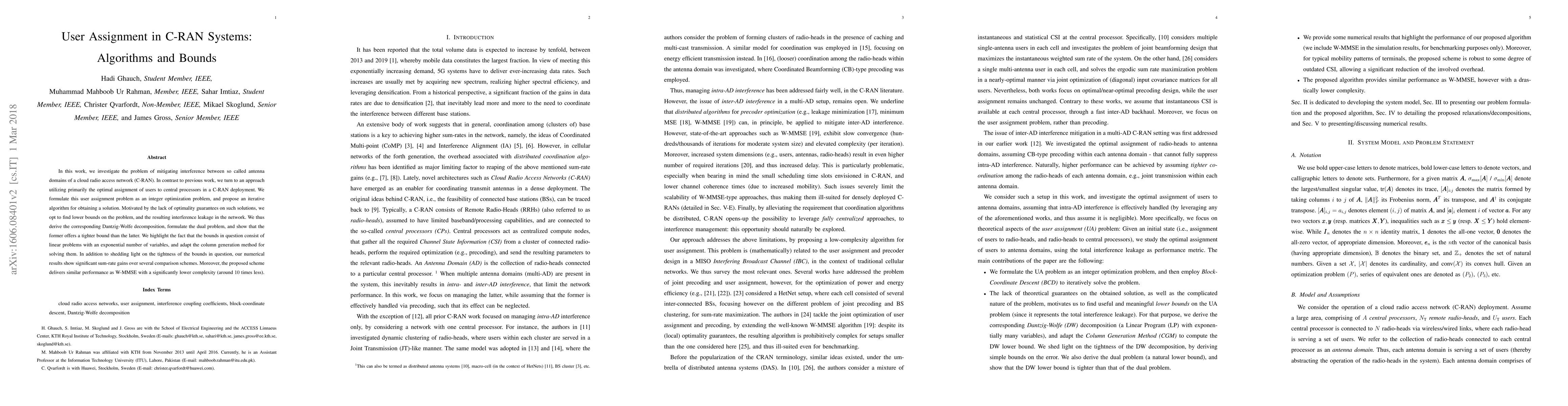 In this work, we investigate the problem of mitigating interference between so called antenna domains of a cloud radio access network (C-RAN). In contrast to previous work, we turn to an approach utilizing primarily the optimal assignment of users to central processors in a C-RAN deployment. We formulate this user assignment problem as an integer optimization problem, and propose an iterative algorithm for obtaining a solution. Motivated by the lack of optimality guarantees on such solutions, we opt to find lower bounds on the problem, and the resulting interference leakage in the network. We thus derive the corresponding Dantzig-Wolfe decomposition, formulate the dual problem, and show that the former offers a tighter bound than the latter. We highlight the fact that the bounds in question consist of linear problems with an exponential number of variables, and adapt the column generation method for solving them. In addition to shedding light on the tightness of the bounds in question, our numerical results show significant sum-rate gains over several comparison schemes. Moreover, the proposed scheme delivers similar performance as W-MMSE with a significantly lower complexity (around 10 times less).