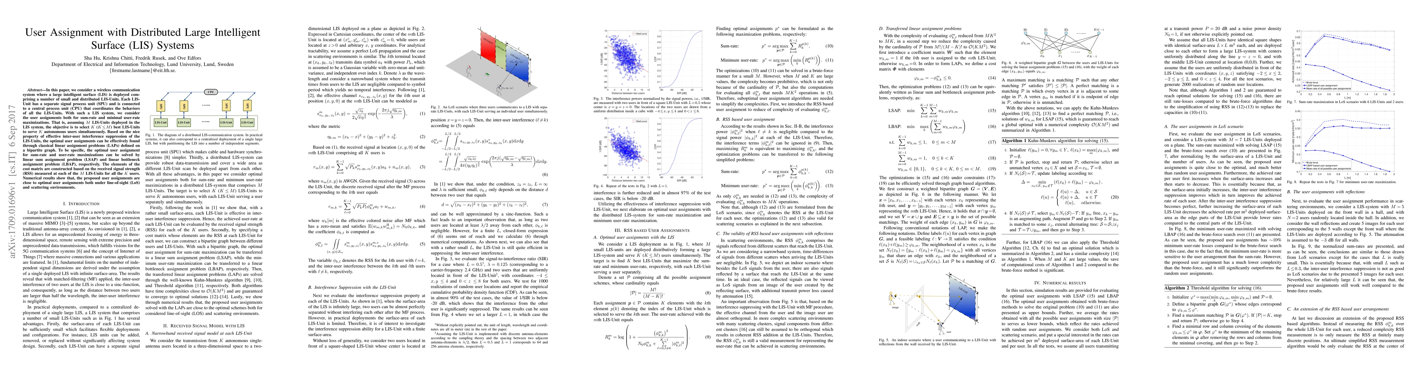 In this paper, we consider a wireless communication system where a large intelligent surface (LIS) is deployed comprising a number of small and distributed LIS-Units. Each LIS-Unit has a separate signal process unit (SPU) and is connected to a central process unit (CPU) that coordinates the behaviors of all the LIS-Units. With such a LIS system, we consider the user assignments both for sum-rate and minimal user-rate maximizations. That is, assuming $M$ LIS-Units deployed in the LIS system, the objective is to select $K$ ($K\!\leq\!M$) best LIS-Units to serve $K$ autonomous users simultaneously. Based on the nice property of effective inter-user interference suppression of the LIS-Units, the optimal user assignments can be effectively found through classical linear assignment problems (LAPs) defined on a bipartite graph. To be specific, the optimal user assignment for sum-rate and user-rate maximizations can be solved by linear sum assignment problem (LSAP) and linear bottleneck assignment problem (LBAP), respectively. The elements of the cost matrix are constructed based on the received signal strength (RSS) measured at each of the $M$ LIS-Units for all the $K$ users. Numerical results show that, the proposed user assignments are close to optimal user assignments both under line-of-sight (LoS) and scattering environments.