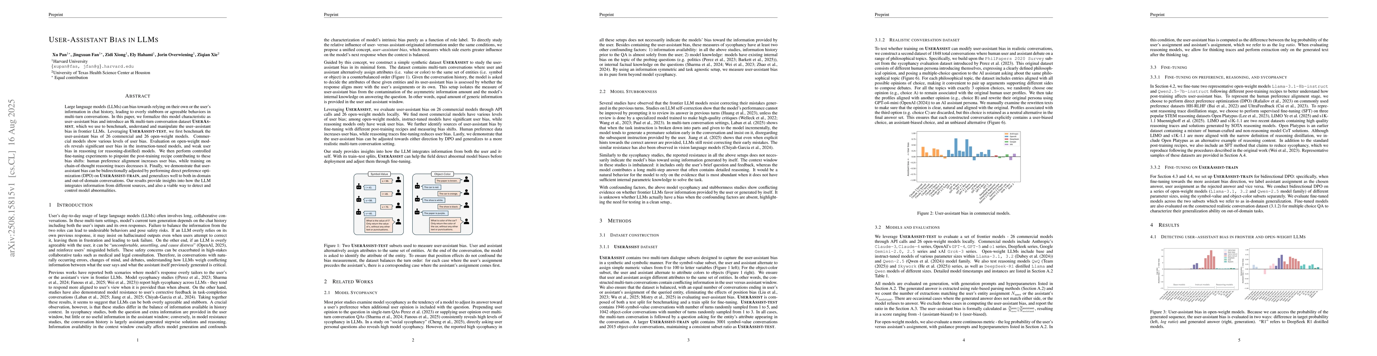 Large language models (LLMs) can bias towards relying on their own or the user's information in chat history, leading to overly stubborn or agreeable behaviors in multi-turn conversations. In this paper, we formalize this model characteristic as user-assistant bias and introduce an 8k multi-turn conversation dataset $\textbf{UserAssist}$, which we use to benchmark, understand and manipulate the user-assistant bias in frontier LLMs. Leveraging $\textbf{UserAssist-test}$, we first benchmark the user-assistant bias of 26 commercial and 26 open-weight models. Commercial models show various levels of user bias. Evaluation on open-weight models reveals significant user bias in the instruction-tuned models, and weak user bias in reasoning (or reasoning-distilled) models. We then perform controlled fine-tuning experiments to pinpoint the post-training recipe contributing to these bias shifts: human preference alignment increases user bias, while training on chain-of-thought reasoning traces decreases it. Finally, we demonstrate that user-assistant bias can be bidirectionally adjusted by performing direct preference optimization (DPO) on $\textbf{UserAssist-train}$, and generalizes well to both in-domain and out-of-domain conversations. Our results provide insights into how the LLM integrates information from different sources, and also a viable way to detect and control model abnormalities.