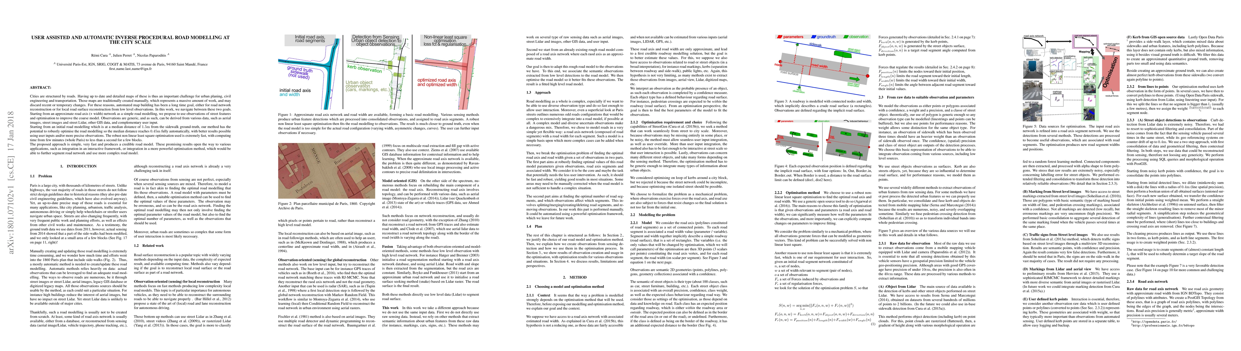 This research presents a method to automatically improve road models in cities using observations and optimization, starting from a rough road axis network. The approach, which can incorporate various data types and user input, reduces the median distance error from 1.5 to 0.45 meters, demonstrating fast and effective urban road modeling for planning and engineering applications.