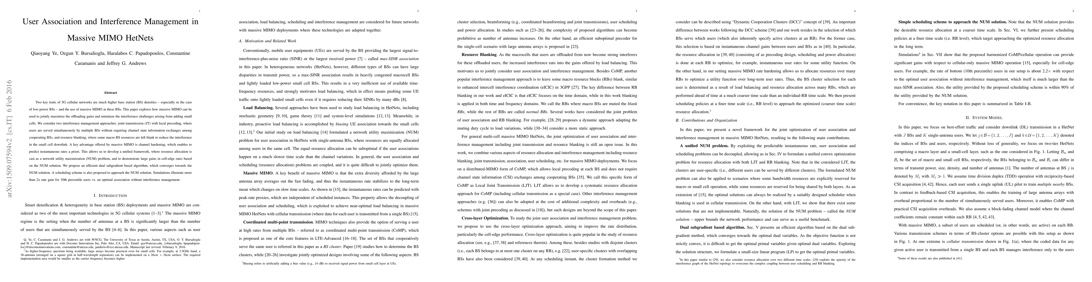 The paper explores user association and interference management in Massive MIMO HetNets using joint transmission (JT) with local precoding and resource blanking approaches, formulating a unified network utility maximization (NUM) problem and proposing an efficient dual subgradient algorithm.