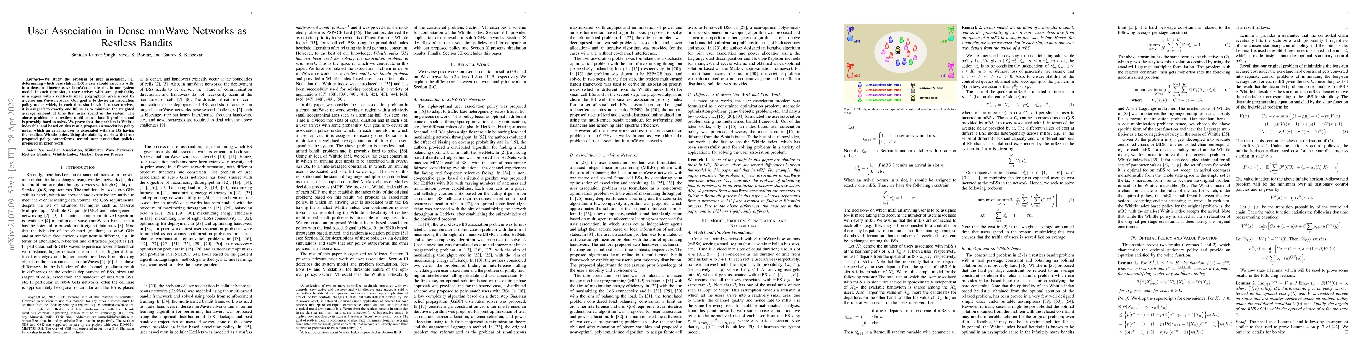 This paper addresses user association in dense millimeter wave networks, framing it as a restless multi-armed bandit problem. It proposes an association policy that assigns users to the base station with the smallest Whittle index to minimize the average time users spend in the system, demonstrating superior performance over prior policies through simulations.
