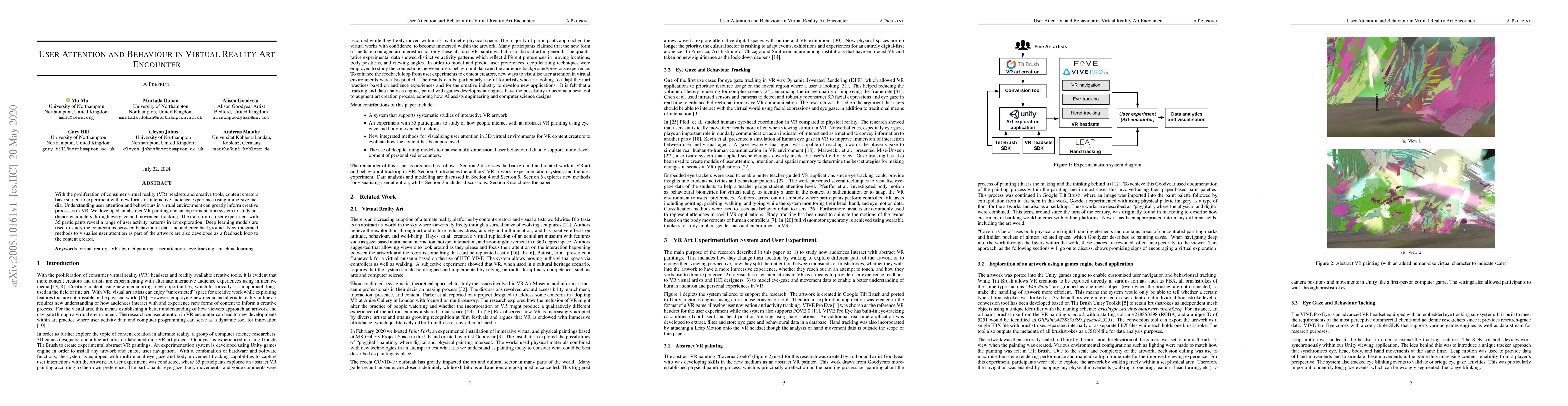 This study explores how user attention and behaviour influence interactions in immersive VR art experiences, employing eye gaze and movement tracking to gather data from 35 participants. The findings reveal diverse activity patterns, and deep learning models link behavioural data to audience backgrounds, while new visualisation methods provide feedback to content creators.