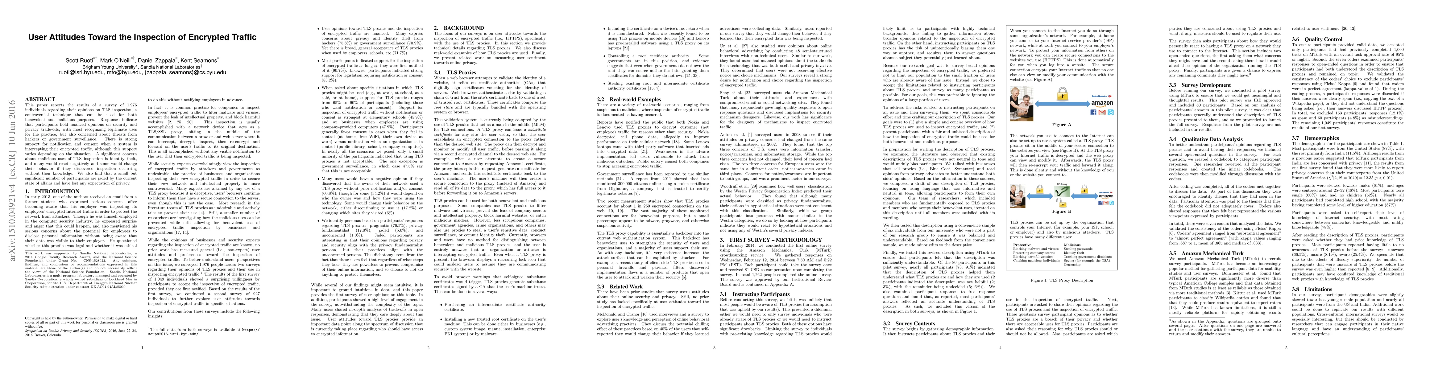 This survey of 1,976 individuals reveals nuanced attitudes toward TLS inspection, highlighting support for consent in intercepting encrypted traffic, while also expressing concerns about privacy threats and identity theft. A minority feels disillusioned about any privacy expectations.