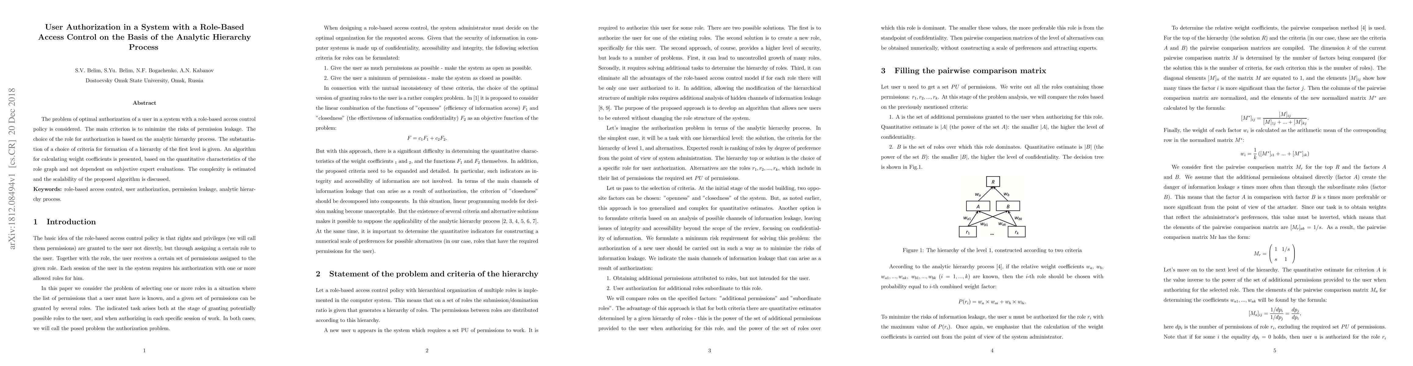 This paper proposes an algorithm for optimal user authorization in a role-based access control system, minimizing permission leakage risks using the analytic hierarchy process. It presents a method to calculate weight coefficients based on role graph characteristics, ensuring objectivity and discussing the algorithm's complexity and scalability.