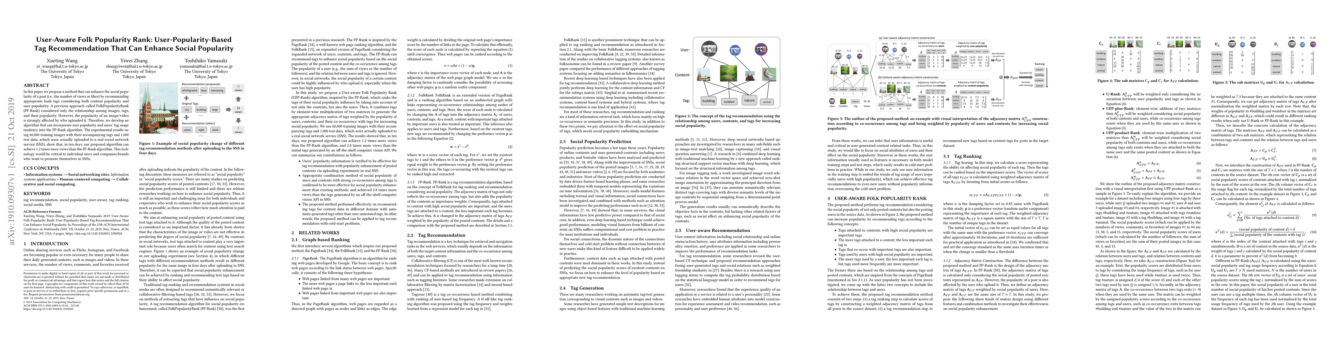 In this paper we propose a method that can enhance the social popularity of a post (i.e., the number of views or likes) by recommending appropriate hash tags considering both content popularity and user popularity. A previous approach called FolkPopularityRank (FP-Rank) considered only the relationship among images, tags, and their popularity. However, the popularity of an image/video is strongly affected by who uploaded it. Therefore, we develop an algorithm that can incorporate user popularity and users' tag usage tendency into the FP-Rank algorithm. The experimental results using 60,000 training images with their accompanying tags and 1,000 test data, which were actually uploaded to a real social network service (SNS), show that, in ten days, our proposed algorithm can achieve 1.2 times more views than the FP-Rank algorithm. This technology would be critical to individual users and companies/brands who want to promote themselves in SNSs.