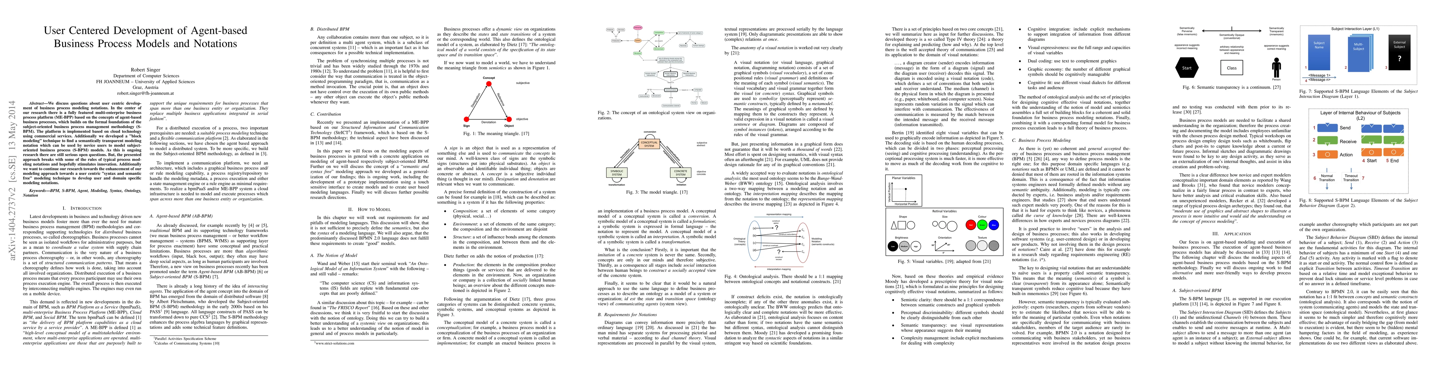 This paper explores user-centered development of agent-based business process models using a multi-enterprise business process platform (ME-BPP) based on subject-oriented business process management. The authors introduce a "block modeling" technique aimed at creating a semantically transparent notation accessible to novice users, while acknowledging ongoing research and open questions.