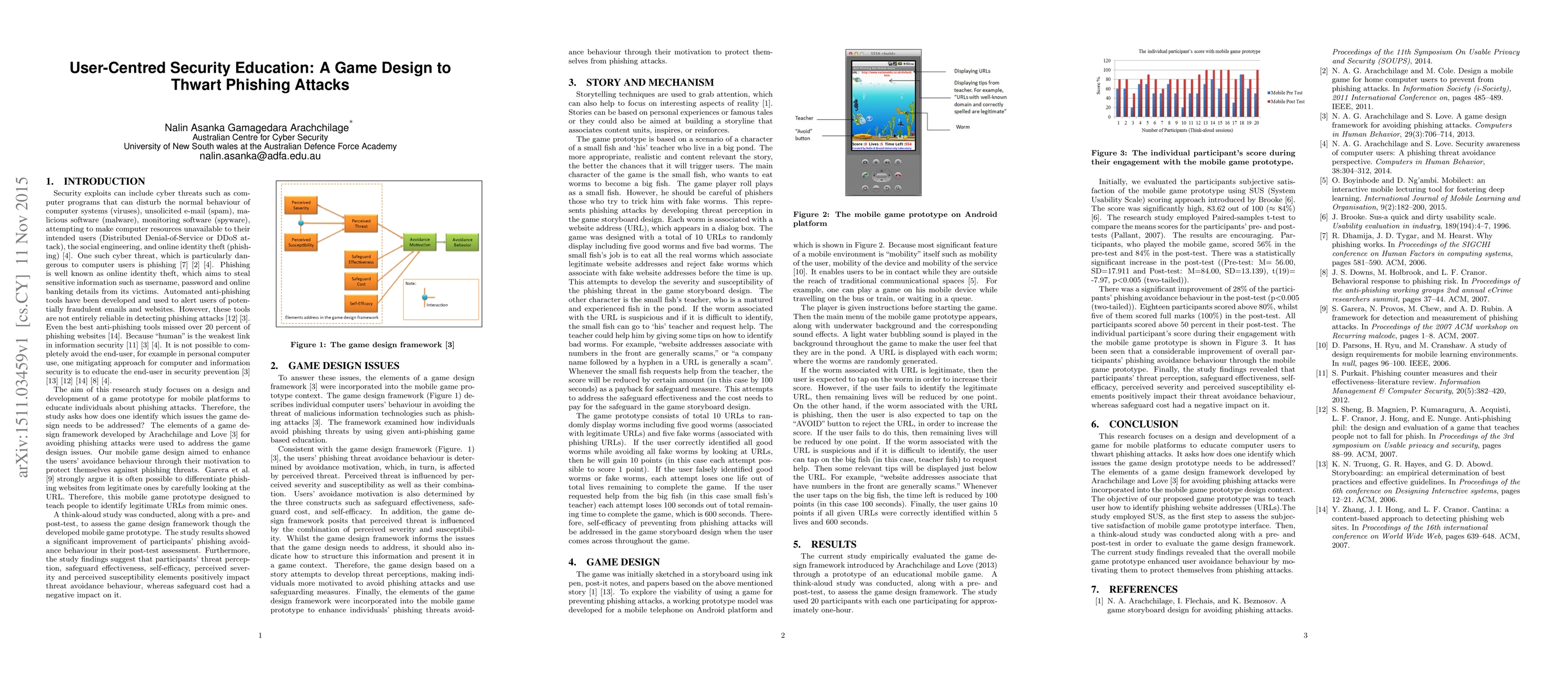 This paper develops a mobile game prototype to educate users about phishing threats and improve their avoidance behavior. The study found significant improvements in phishing avoidance post-game use, indicating that game design principles effectively enhance user education and motivation.