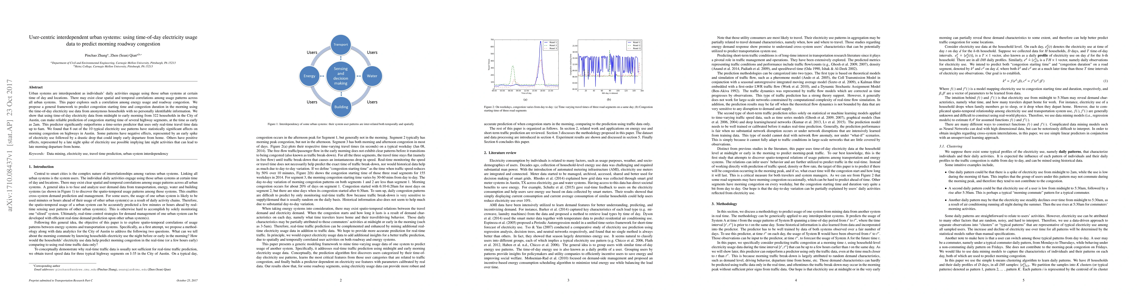 This paper proposes a framework to predict morning roadway congestion using time-of-day electricity usage data from households. It demonstrates that electricity usage patterns from midnight to early morning can reliably predict congestion starting times, outperforming traditional travel time data-based predictors.