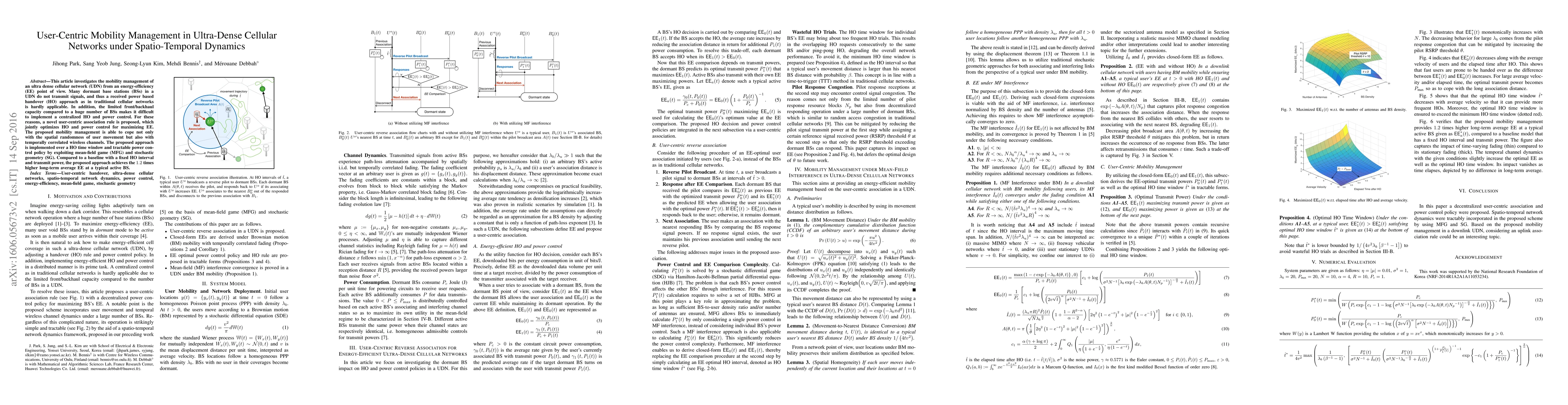 This paper proposes a user-centric mobility management strategy for ultra-dense cellular networks, optimizing handover and power control to maximize energy efficiency while addressing spatial and temporal dynamics. The approach leverages mean-field game and stochastic geometry, achieving 1.2 times higher energy efficiency compared to traditional methods.