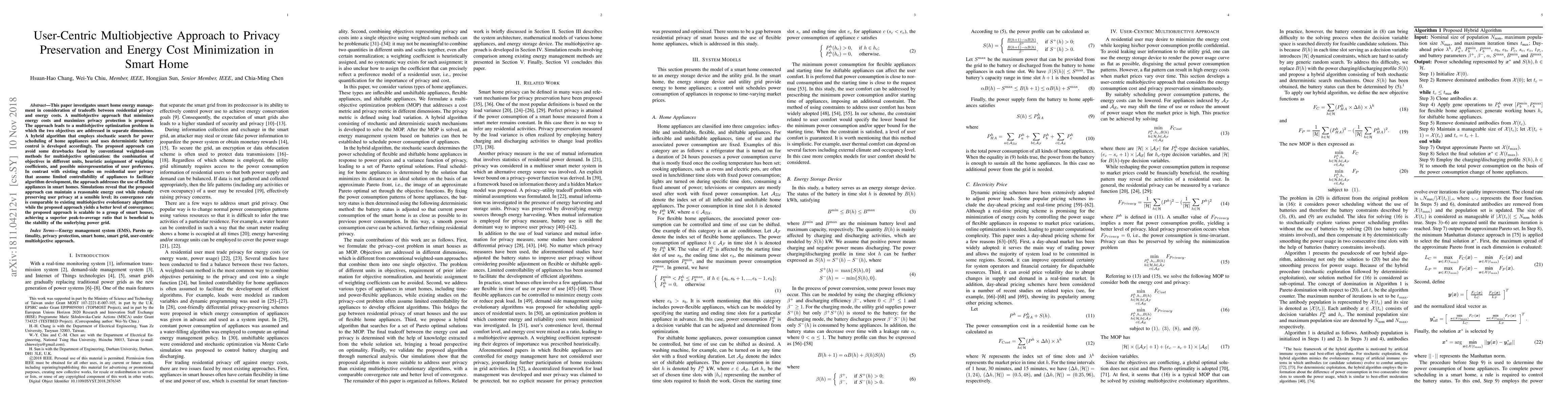 A user-centric approach optimizes smart home energy management while preserving privacy, using a hybrid algorithm to minimize costs and protect personal data. Simulations show the method can maintain reasonable energy costs with robust privacy protection and is scalable for multiple homes.