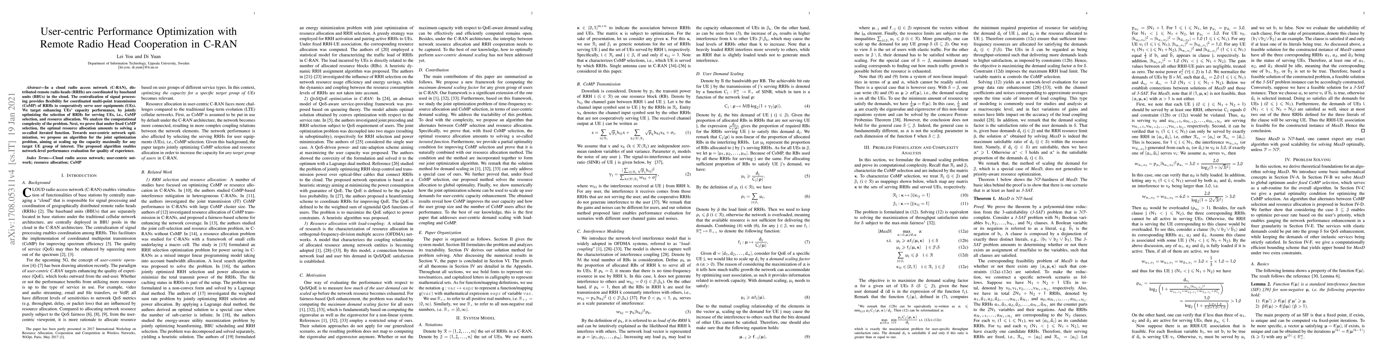 In a cloud radio access network (C-RAN), distributed remote radio heads (RRHs) are coordinated by baseband units (BBUs) in the cloud. The centralization of signal processing provides flexibility for coordinated multi-point transmission (CoMP) of RRHs to cooperatively serve user equipments (UEs). We target enhancing UEs' capacity performance, by jointly optimizing the selection of RRHs for serving UEs, i.e., resource allocation (and CoMP selection). We analyze the computational complexity of the problem. Next, we prove that under fixed CoMP selection, the optimal resource allocation amounts to solving a so-called iterated function. Towards user-centric network optimization, we propose an algorithm for the joint optimization problem, aiming at maximumly scaling up the capacity for any target UE group of interest. The proposed algorithm enables network-level performance evaluation for quality of experience.