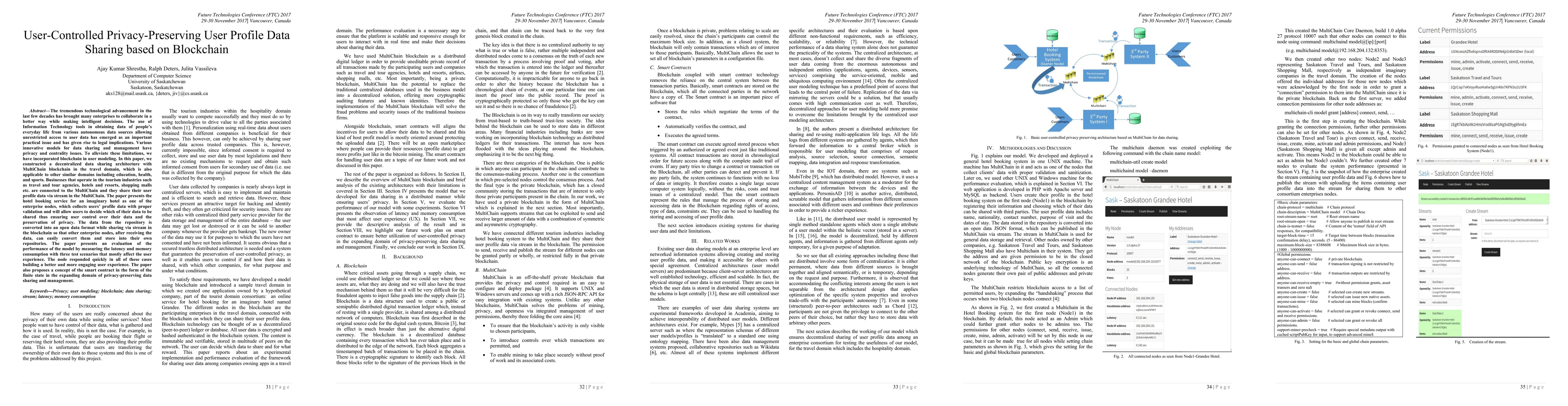 This paper proposes a decentralized data sharing architecture using MultiChain blockchain to enable user-controlled privacy-preserving sharing of user profile data in the travel domain, ensuring users can decide which data to share while maintaining privacy. The model was evaluated for performance, showing low latency and memory consumption.
