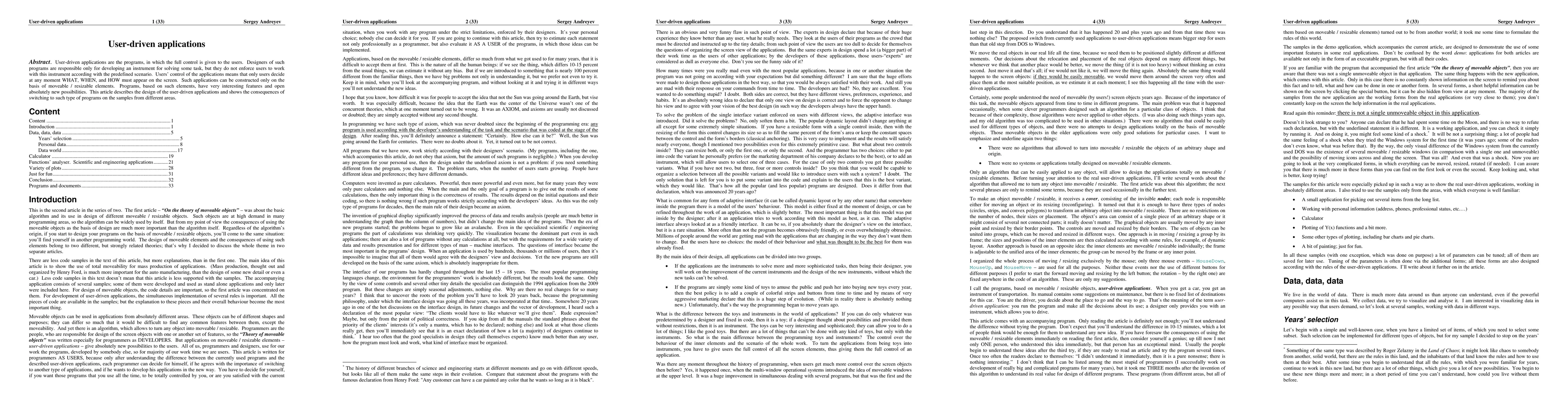 User-driven applications are the programs, in which the full control is given to the users. Designers of such programs are responsible only for developing an instrument for solving some task, but they do not enforce users to work with this instrument according with the predefined scenario. Users' control of the applications means that only users decide at any moment WHAT, WHEN, and HOW must appear on the screen. Such applications can be constructed only on the basis of moveable / resizable elements. Programs, based on such elements, have very interesting features and open absolutely new possibilities. This article describes the design of the user-driven applications and shows the consequences of switching to such type of programs on the samples from different areas.