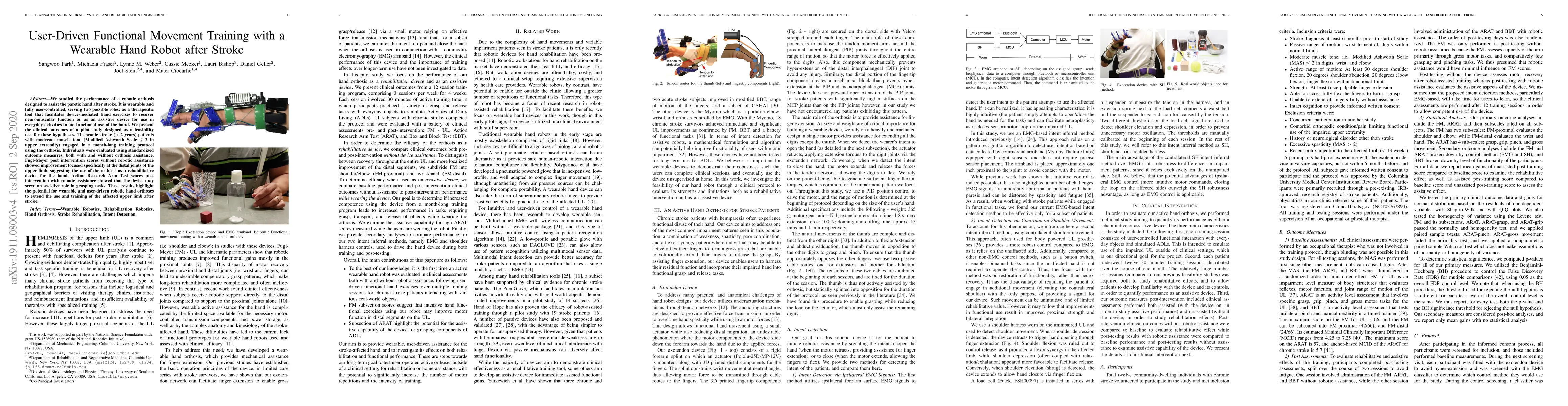 This study investigates a wearable, user-controlled robotic orthosis aiding hand function post-stroke, showing improved distal joint performance and grasping tasks in chronic stroke patients after a month-long training protocol. The findings suggest the orthosis's potential as both a rehabilitative and assistive tool.