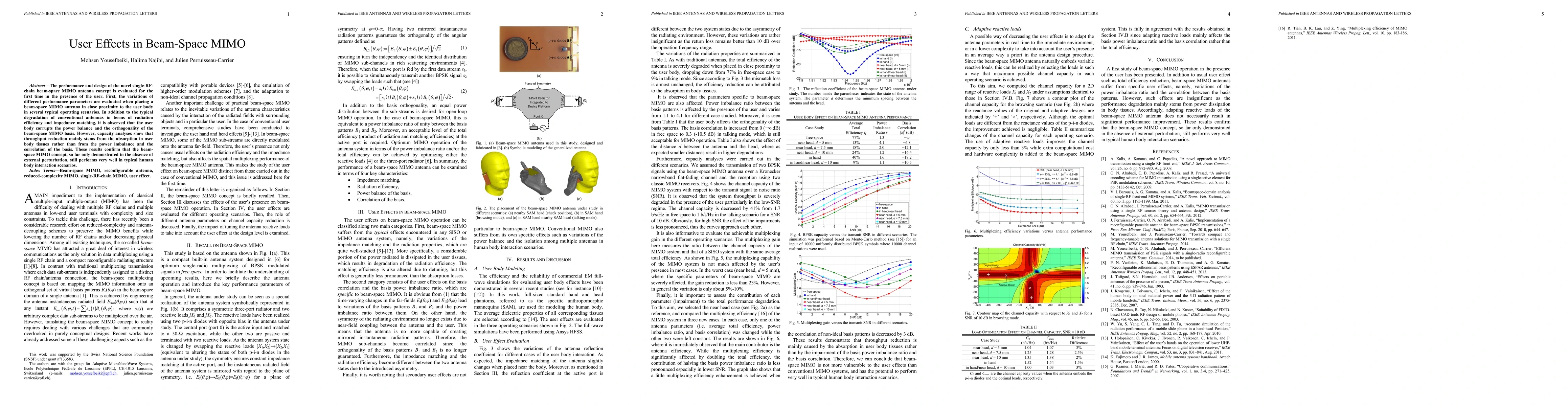 The performance and design of the novel single-RF-chain beam-space MIMO antenna concept is evaluated for the first time in the presence of the user. First, the variations of different performance parameters are evaluated when placing a beam-space MIMO antenna in close proximity to the user body in several typical operating scenarios. In addition to the typical degradation of conventional antennas in terms of radiation efficiency and impedance matching, it is observed that the user body corrupts the power balance and the orthogonality of the beam-space MIMO basis. However, capacity analyses show that throughput reduction mainly stems from the absorption in user body tissues rather than from the power imbalance and the correlation of the basis. These results confirm that the beam-space MIMO concept, so far only demonstrated in the absence of external perturbation, still performs very well in typical human body interaction scenarios.