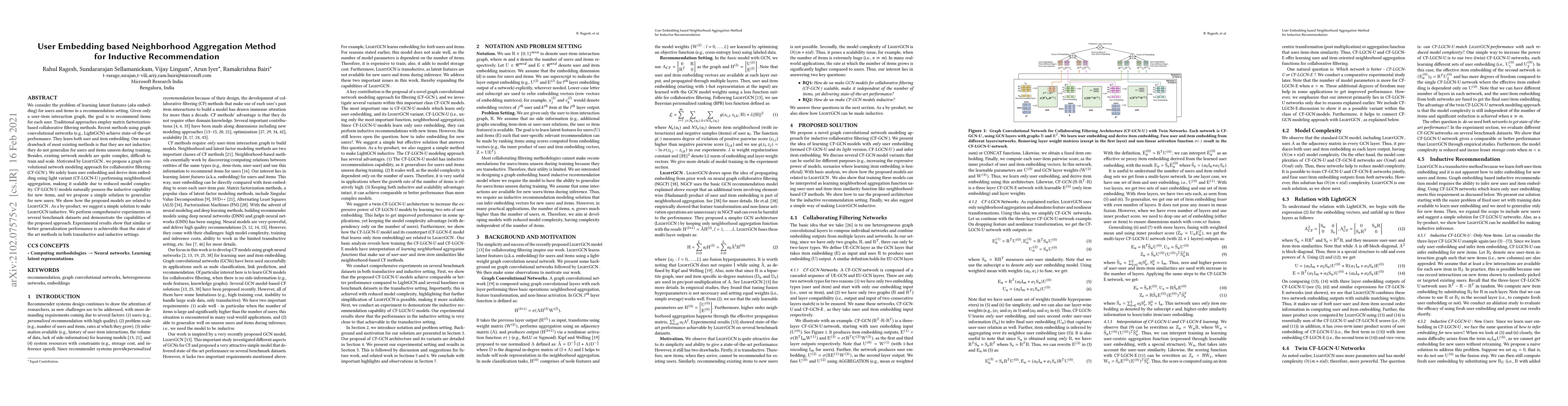 We consider the problem of learning latent features (aka embedding) for users and items in a recommendation setting. Given only a user-item interaction graph, the goal is to recommend items for each user. Traditional approaches employ matrix factorization-based collaborative filtering methods. Recent methods using graph convolutional networks (e.g., LightGCN) achieve state-of-the-art performance. They learn both user and item embedding. One major drawback of most existing methods is that they are not inductive; they do not generalize for users and items unseen during training. Besides, existing network models are quite complex, difficult to train and scale. Motivated by LightGCN, we propose a graph convolutional network modeling approach for collaborative filtering CF-GCN. We solely learn user embedding and derive item embedding using light variant CF-LGCN-U performing neighborhood aggregation, making it scalable due to reduced model complexity. CF-LGCN-U models naturally possess the inductive capability for new items, and we propose a simple solution to generalize for new users. We show how the proposed models are related to LightGCN. As a by-product, we suggest a simple solution to make LightGCN inductive. We perform comprehensive experiments on several benchmark datasets and demonstrate the capabilities of the proposed approach. Experimental results show that similar or better generalization performance is achievable than the state of the art methods in both transductive and inductive settings.