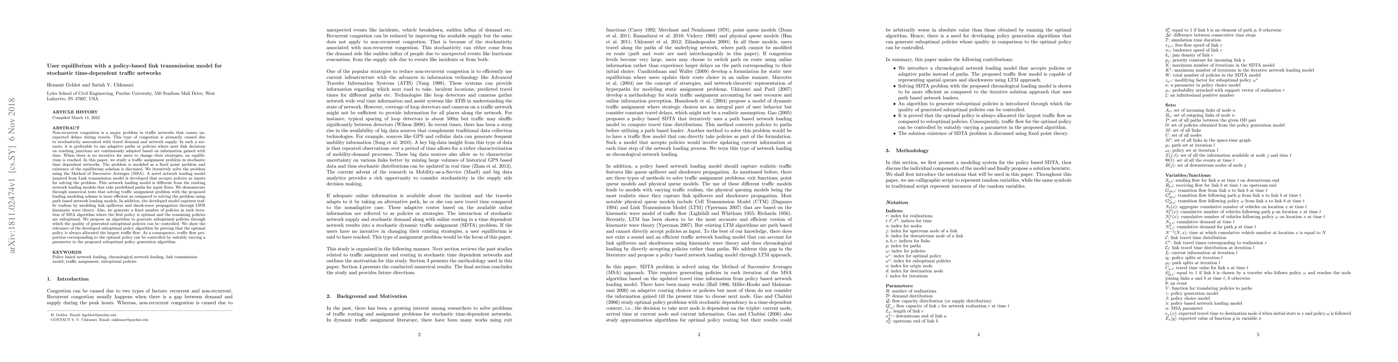 Non-recurrent congestion is a major problem in traffic networks that causes unexpected delays during travels. In such a scenario, it is preferable to use adaptive paths or policies where next link decisions on reaching junctions are continuously adapted based on the information gained with time. In this paper, we study a traffic assignment problem in stochastic time-dependent networks. The problem is modeled as a fixed-point problem and existence of the equilibrium solution is discussed. We iteratively solve the problem using the method of successive averages (MSA). A novel network loading model inspired from Link transmission model is developed that accepts policies as inputs for solving the problem. This network loading model is different from the existing network loading models that take predefined paths for input flows. We demonstrate through numerical tests that solving traffic assignment problem with the proposed loading modeling scheme is more efficient as compared to solving the problem using path-based network loading models.