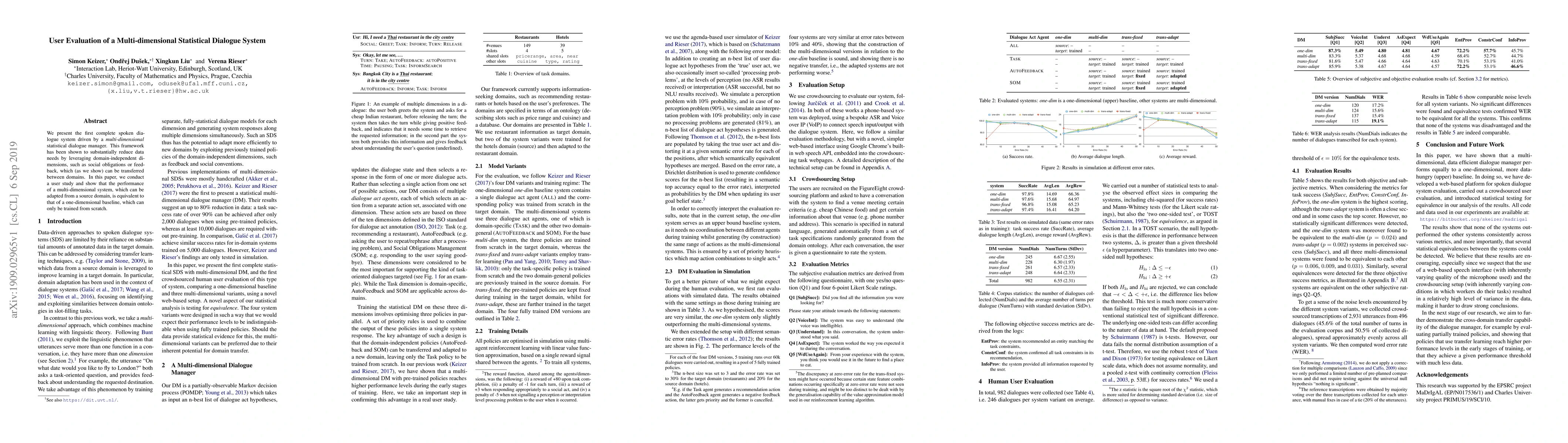 A user study shows that a multi-dimensional statistical dialogue system can perform equally well as a one-dimensional baseline, reducing data needs through domain-independent dimensions such as social obligations or feedback.