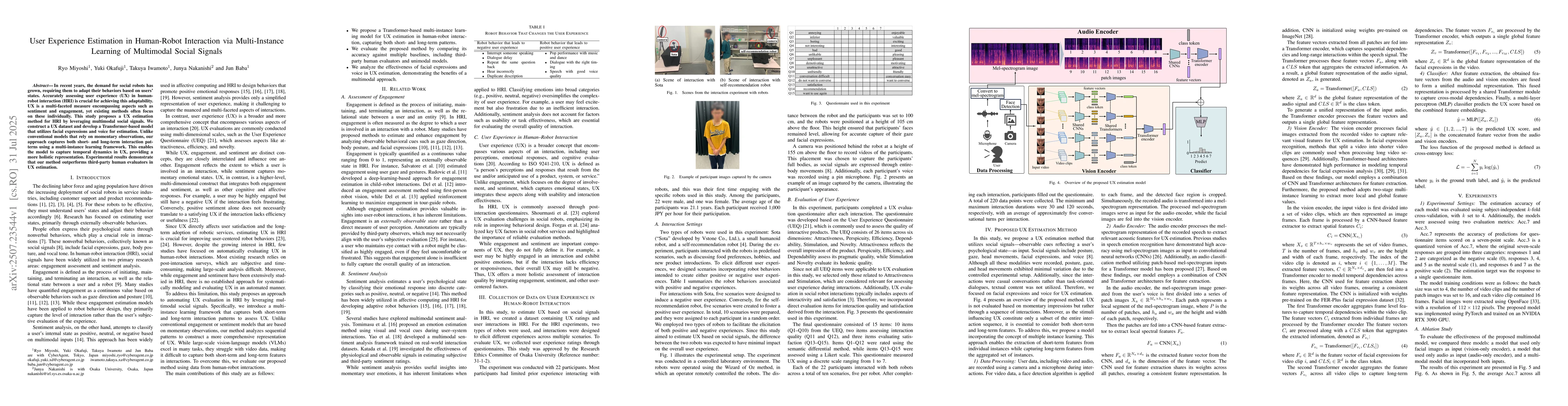 In recent years, the demand for social robots has grown, requiring them to adapt their behaviors based on users' states. Accurately assessing user experience (UX) in human-robot interaction (HRI) is crucial for achieving this adaptability. UX is a multi-faceted measure encompassing aspects such as sentiment and engagement, yet existing methods often focus on these individually. This study proposes a UX estimation method for HRI by leveraging multimodal social signals. We construct a UX dataset and develop a Transformer-based model that utilizes facial expressions and voice for estimation. Unlike conventional models that rely on momentary observations, our approach captures both short- and long-term interaction patterns using a multi-instance learning framework. This enables the model to capture temporal dynamics in UX, providing a more holistic representation. Experimental results demonstrate that our method outperforms third-party human evaluators in UX estimation.